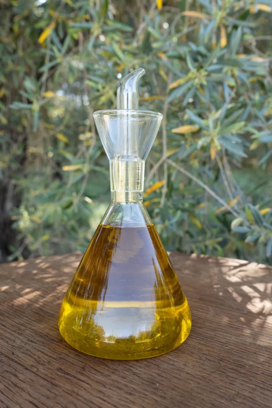 Aceitera de vidrio borosilicato transparente con dispensador extraíble, diseñada para ofrecer durabilidad y facilidad de uso. Ideal para un vertido preciso y cómodo, combinando funcionalidad y estilo en un solo producto.