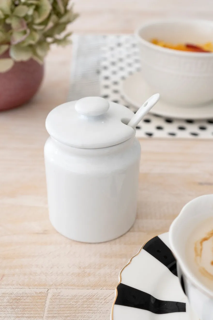 Este azucarero de cerámica blanco con cucharita y tapa, le dará un toque especial a tu mesa.