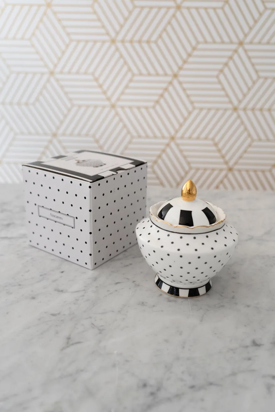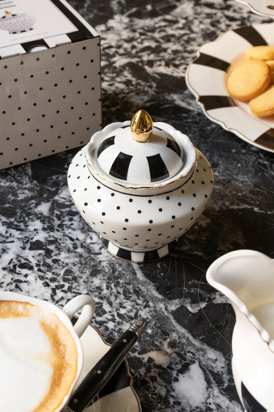 Azucarero de color blanco y negro con filo dorado decorando, de nuestra Colección Cristina Oria, de New Bone China, reconocida por ser muy fina, ligera y resistente.