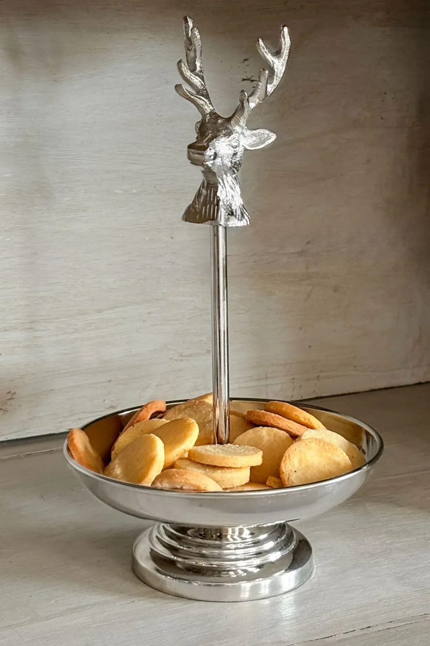 Elegante frutero o centro de mesa plateado, con un acabado brillante que realza su diseño sofisticado. La pieza se eleva sobre una base circular y está coronada por una figura de ciervo con astas. Ideal para presentar galletas, frutas o dulces, o simplemente como elemento decorativo.