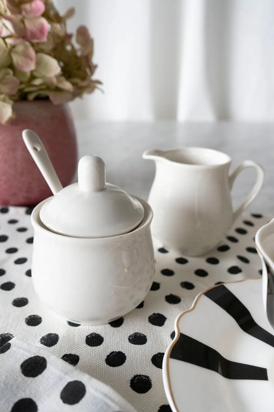 Juego de azucarero y lechera de cerámica en color blanco, ideal para complementar tu mesa en la hora del desayuno o merienda.
