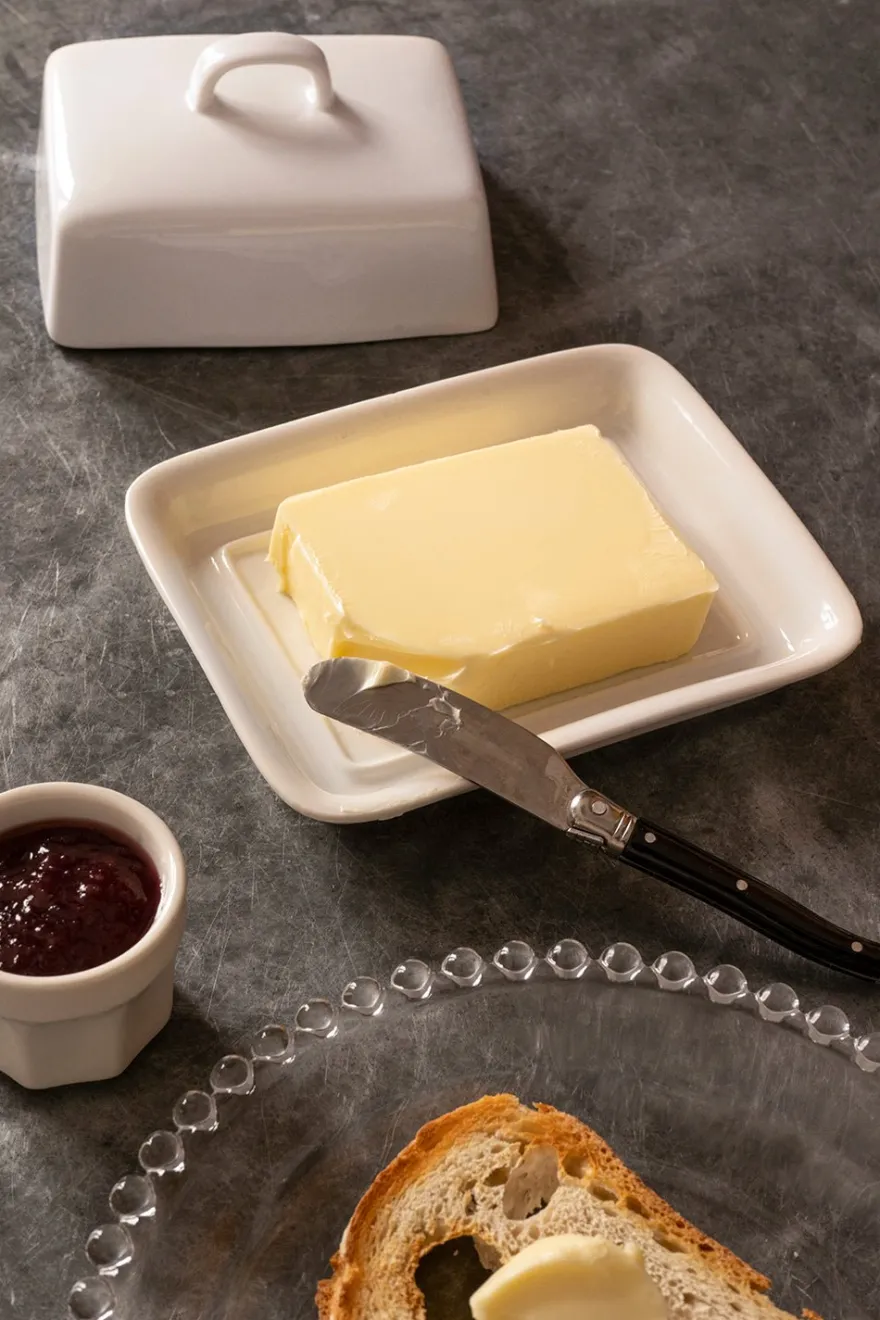 Esta mantequillera de cerámica rectangular en color blanco, consta de de una parte superior y otra inferior, y tiene un tamaño ideal para complementar tu mesa.