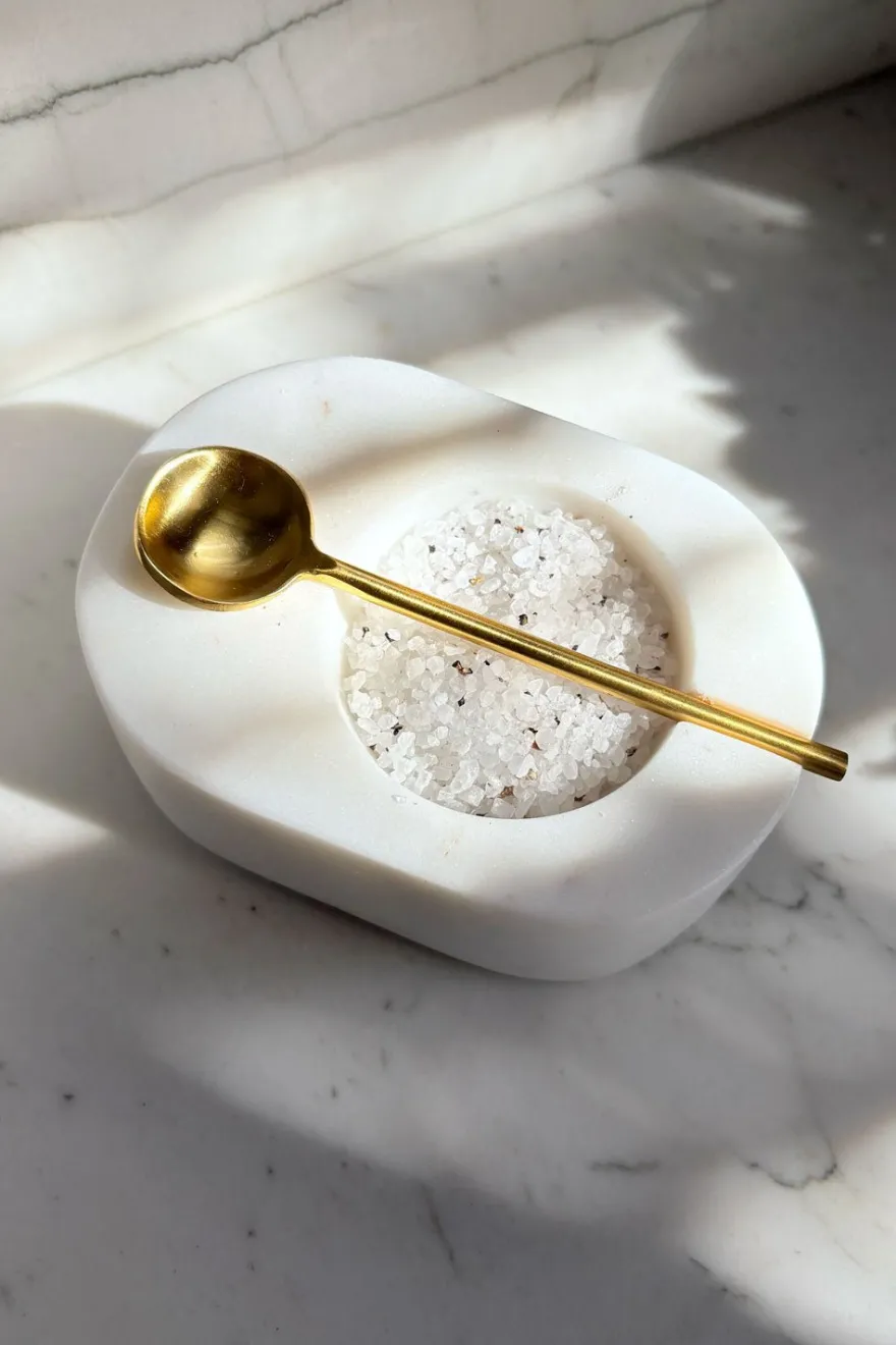 Elegante recipiente de mármol blanco, ideal para servir sal, especias o salsas especiales. Su diseño minimalista realza las vetas naturales del mármol, haciendo que cada pieza sea única.