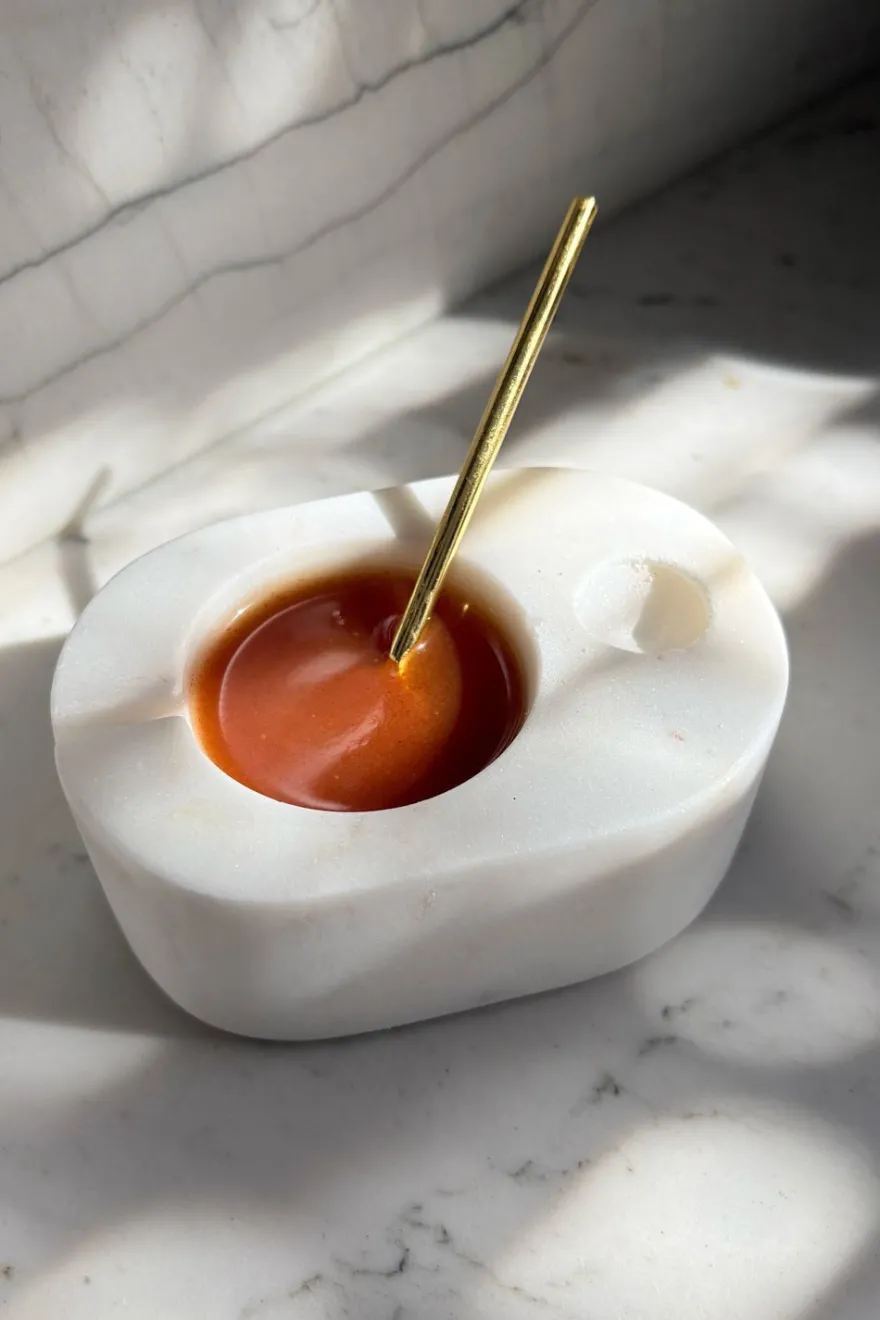 Incluye una cucharita de latón dorado que aporta un toque sofisticado. Además, cuenta con una práctica hendidura para colocarla cómodamente y tenerla siempre a mano.
