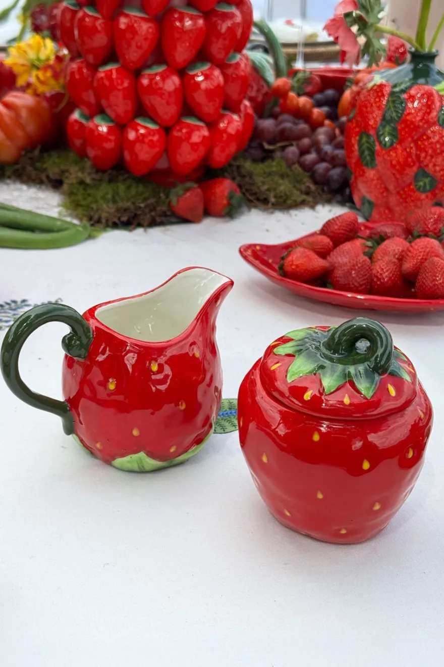 Set de azucarero y lechera de loza fina esmaltada con diseño de fresa,100% artesanal, ideal para complementar y dar un toque fresco, original y diferente a tus mesas.
