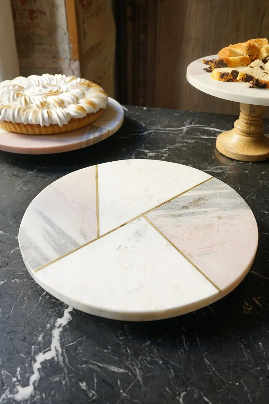 Base giratoria de mármol con distintos colores (rosa, gris y blanco), ideal y cómoda para servir el aperitivo.