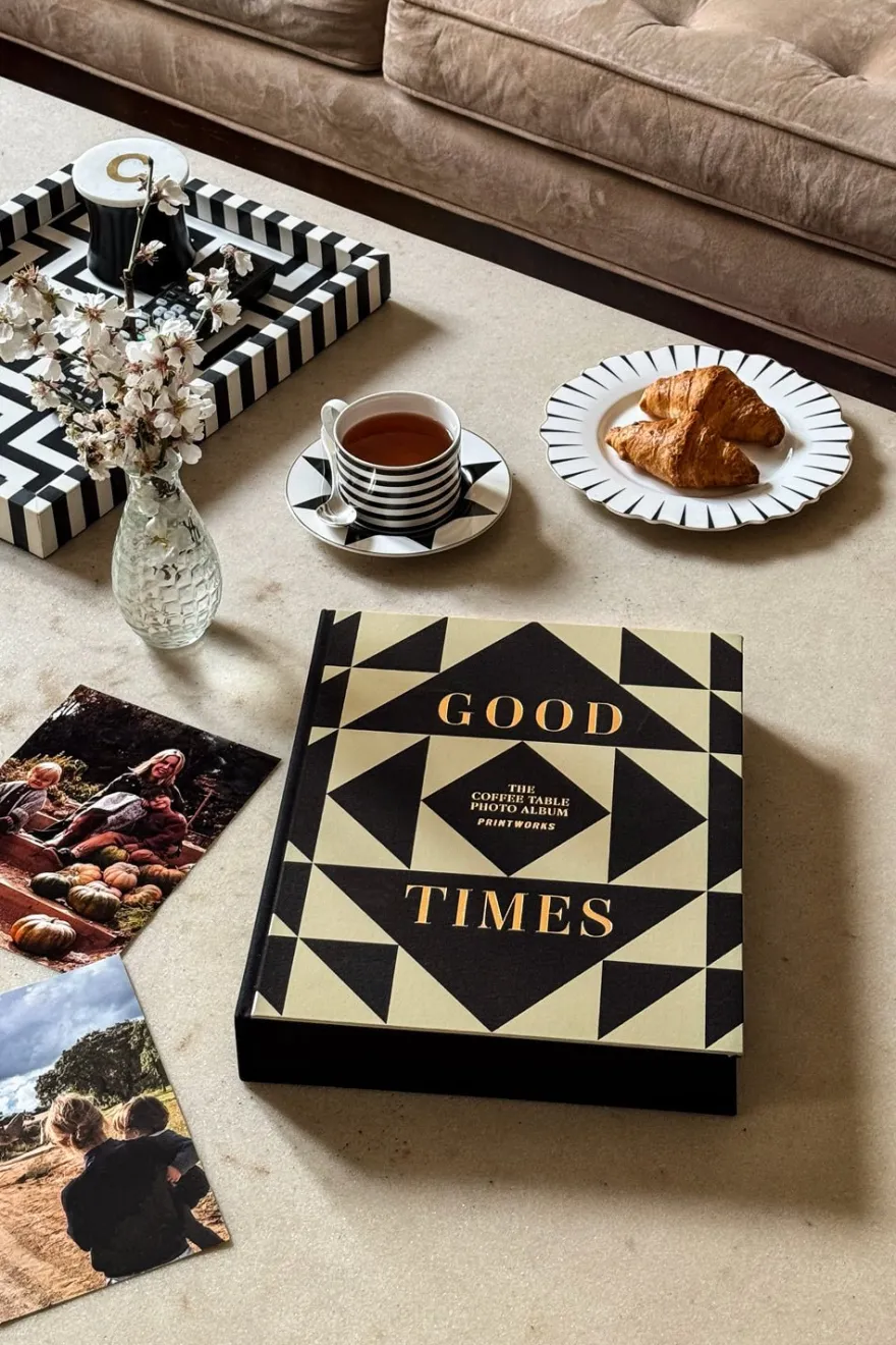 Tiene una elegante portada de tela beige y negra con texto en foil dorado. En su interior, encontrarás 30 páginas de papel fotográfico negro de alta calidad, lo que te permitirá colocar tus fotos fácilmente. Las fotografías deben medir 10 x15 cm, con espacio para notas personales debajo.