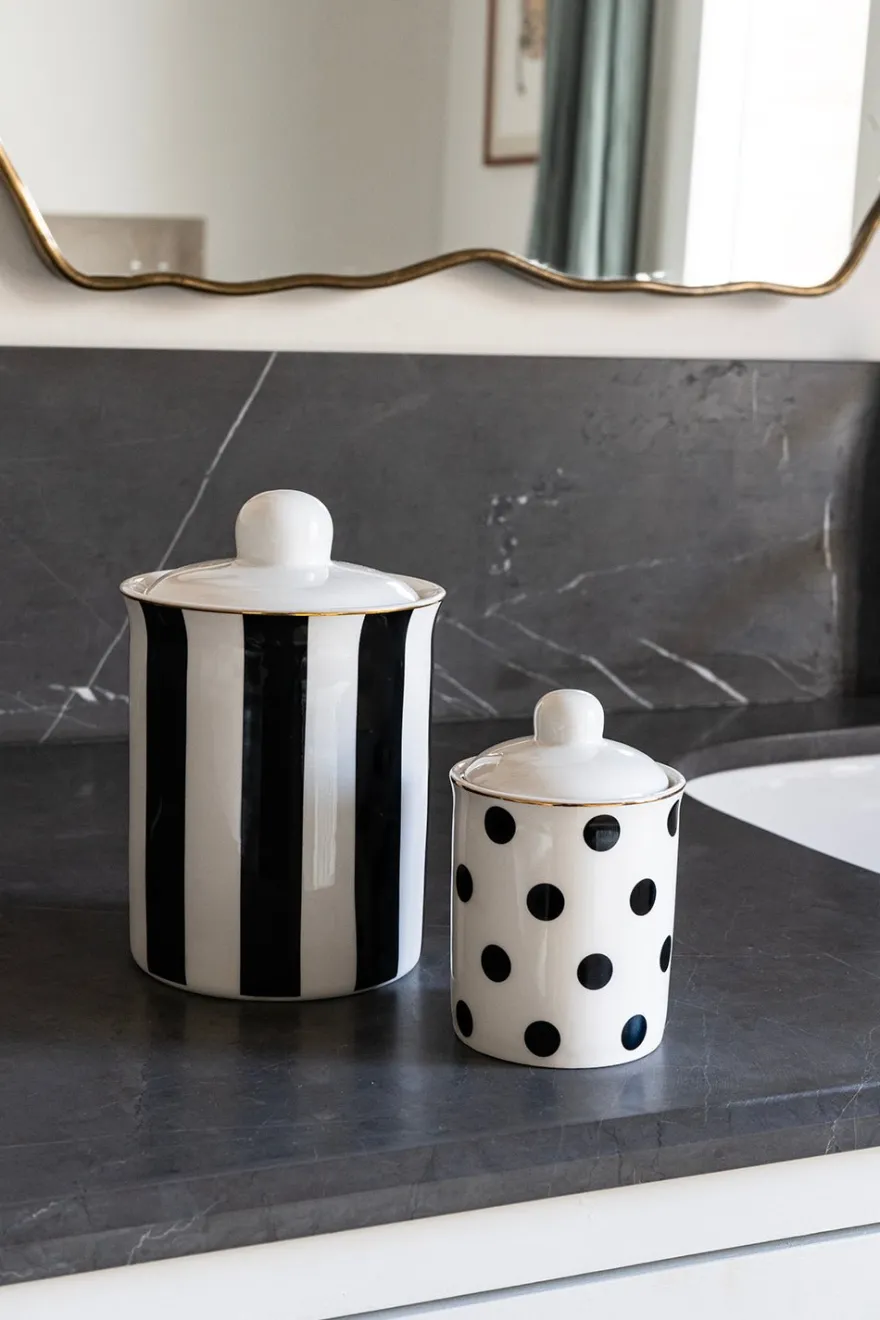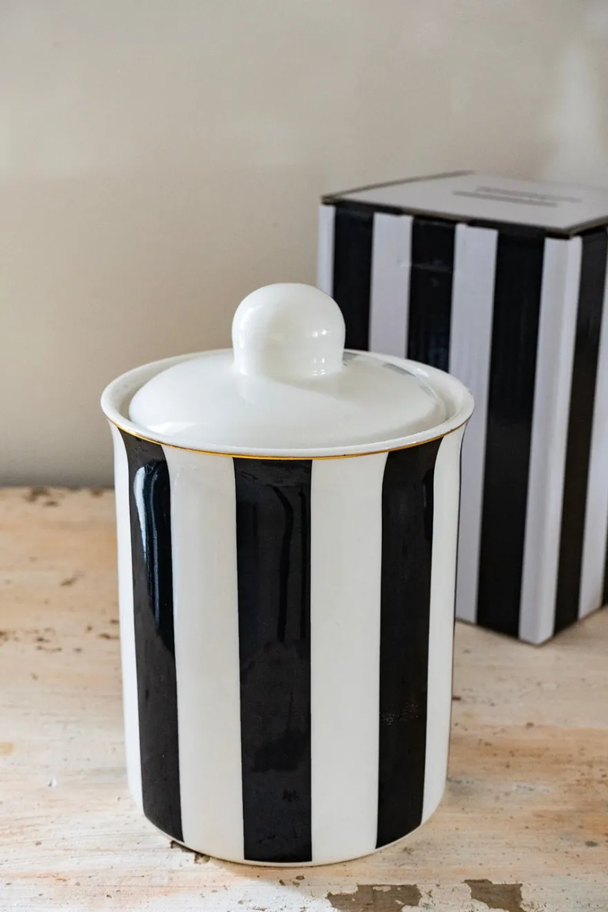 Tarro con tapa y cierre hermético de New Bone China, reconocida por ser muy fina, ligera y resistente, con nuestro diseño propio de rayas negras y blancas y delicado filo dorado decorando, de nuestra Colección Cristina Oria.