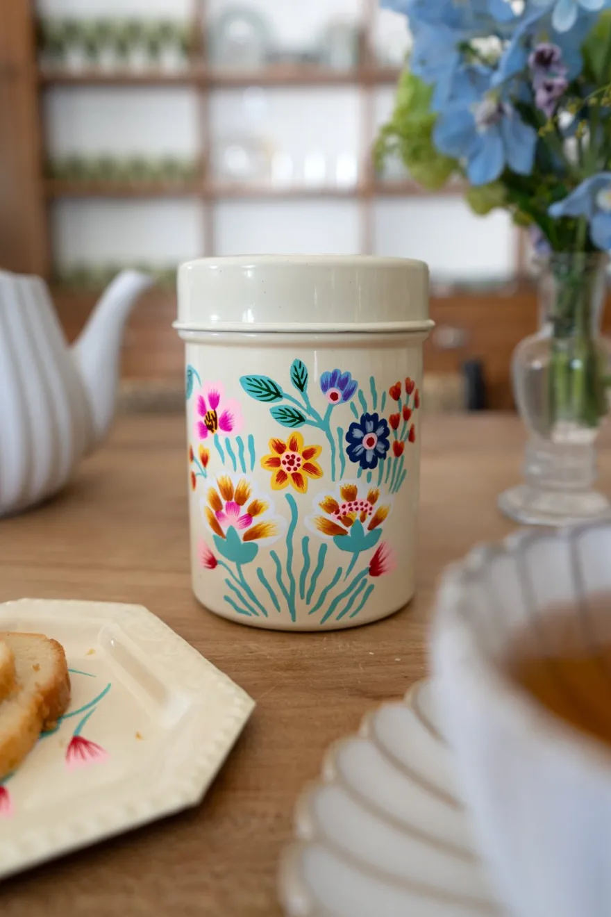 Tarro con tapa de color beige con flores de colores pintadas a mano, ideal para decorar y dar un toque de estilo a cualquier rincón de tu casa.