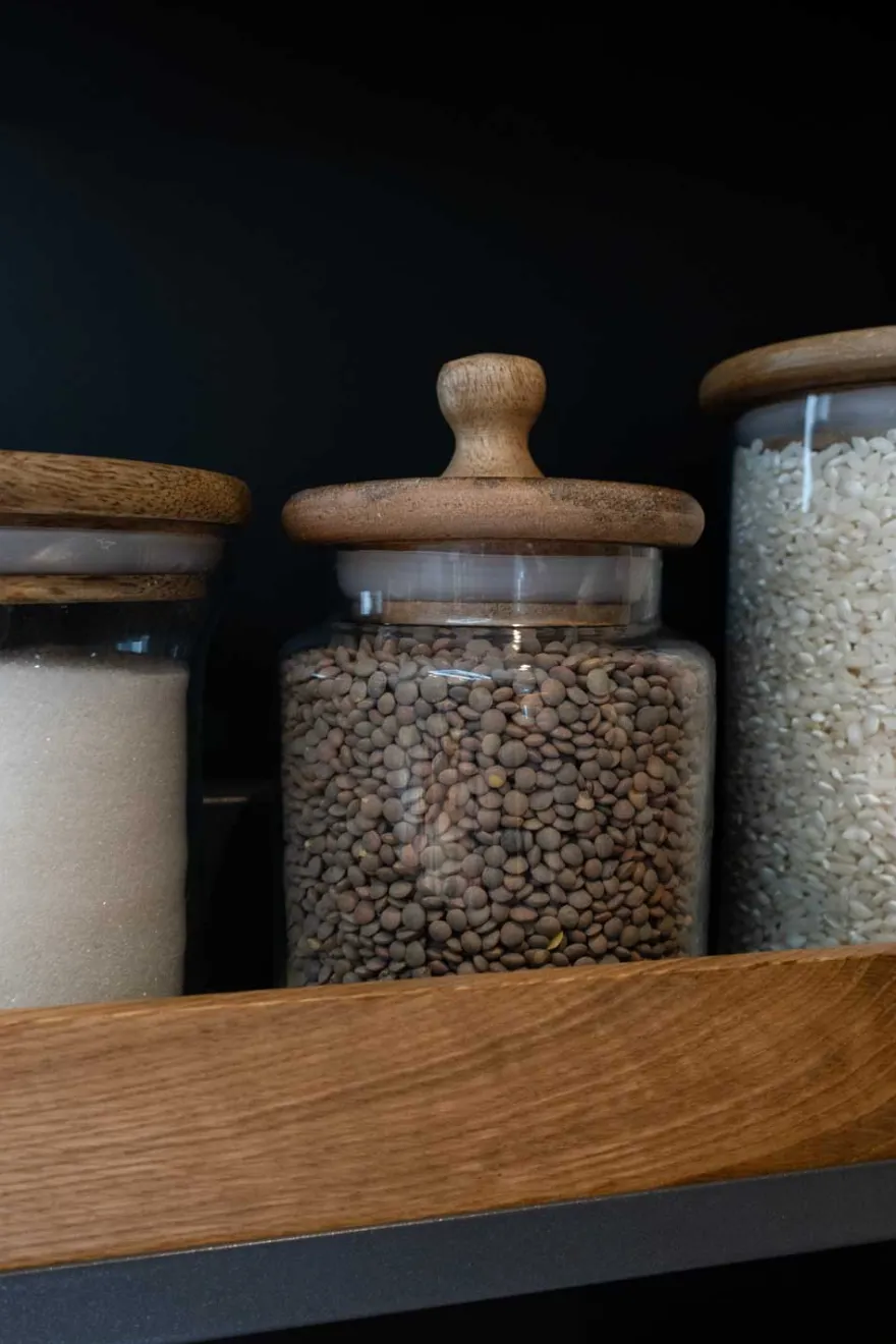 Tarro de cristal con tapa de madera perfecto para almacenar distintos tipos de alimentos como fideos, nueces, harina, especias…