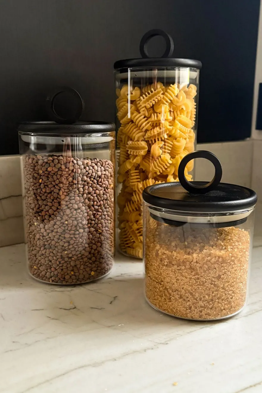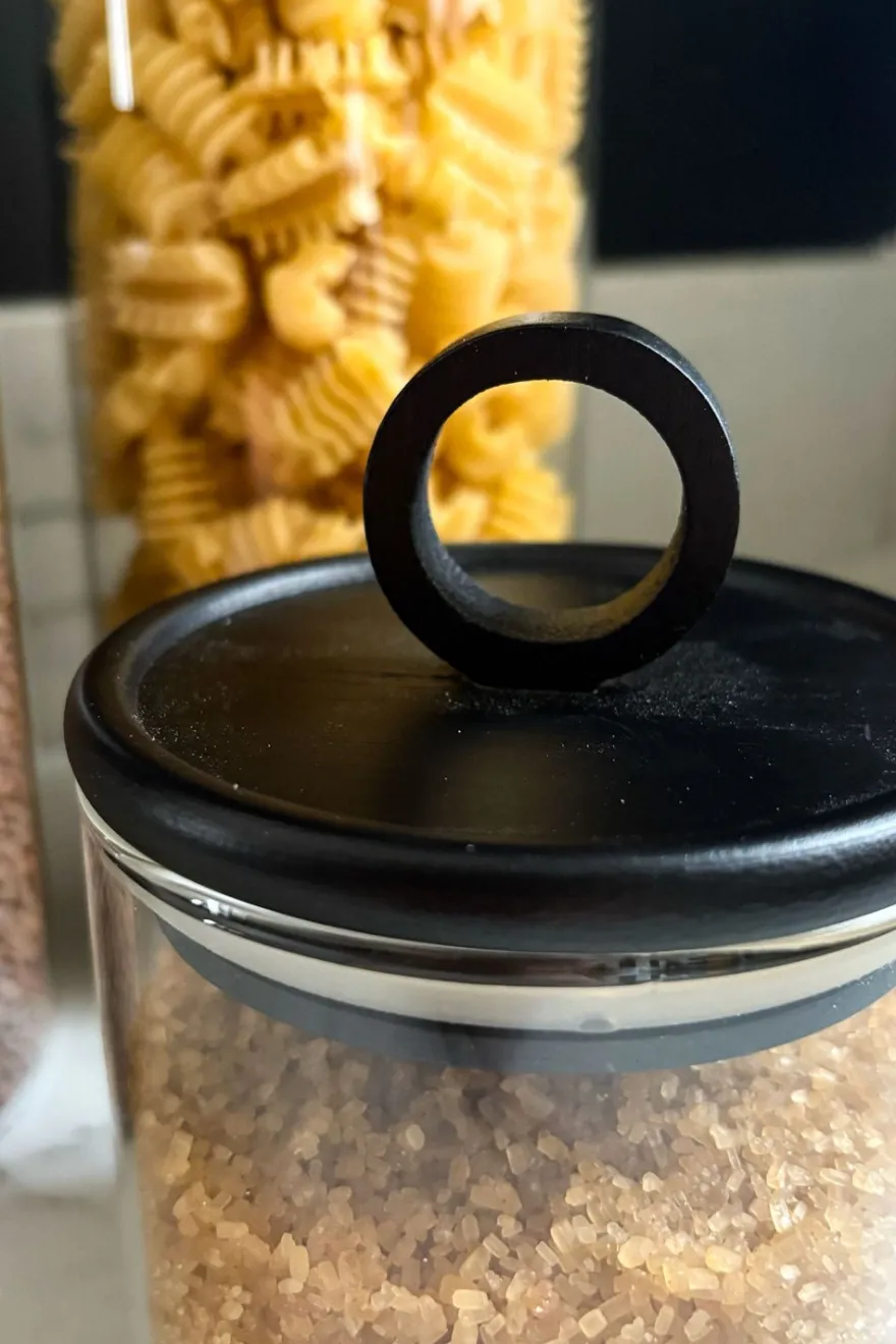 Tarros de cristal con tapas de madera perfectos para almacenar distintos tipos de alimentos como fideos, nueces, harina, especias…