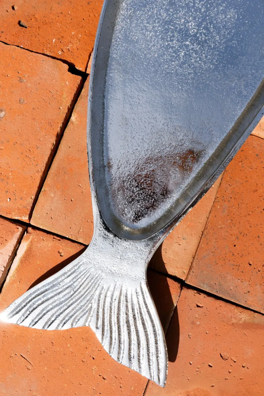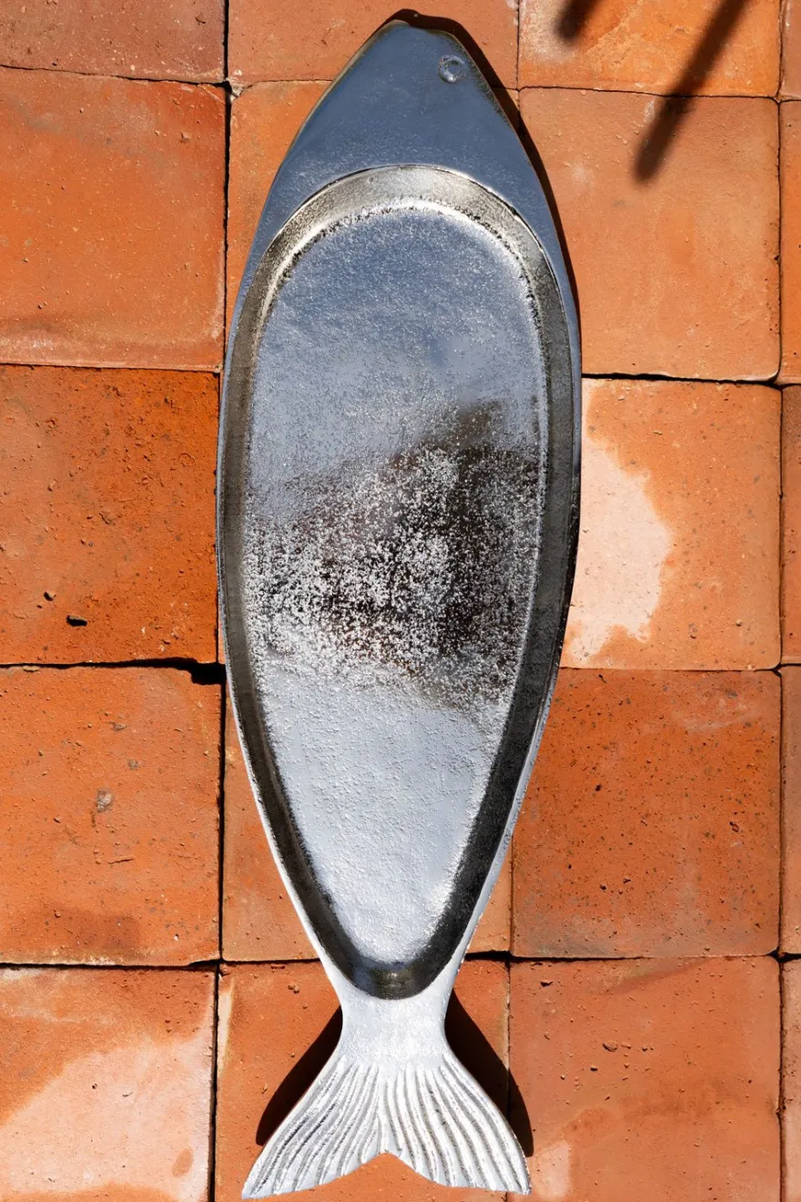 Bandeja alargada plateada con diseño de pez.