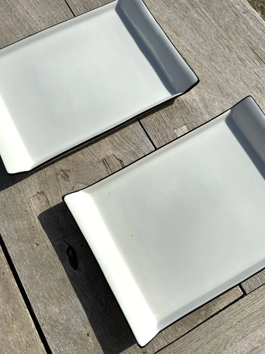 Bandeja rectangular con asas de porcelana de alta calidad con filo negro, resistente al uso diario. Perfecta para presentar carnes, pescados, guarniciones, y para complementar tus mesas.