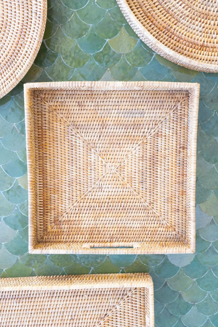 Bandeja cuadrada de ratán con asas, ideal para servir con estilo, organizar tu espacio o como elemento decorativo. Esta colección combina la belleza del material natural con la funcionalidad y el diseño contemporáneo.