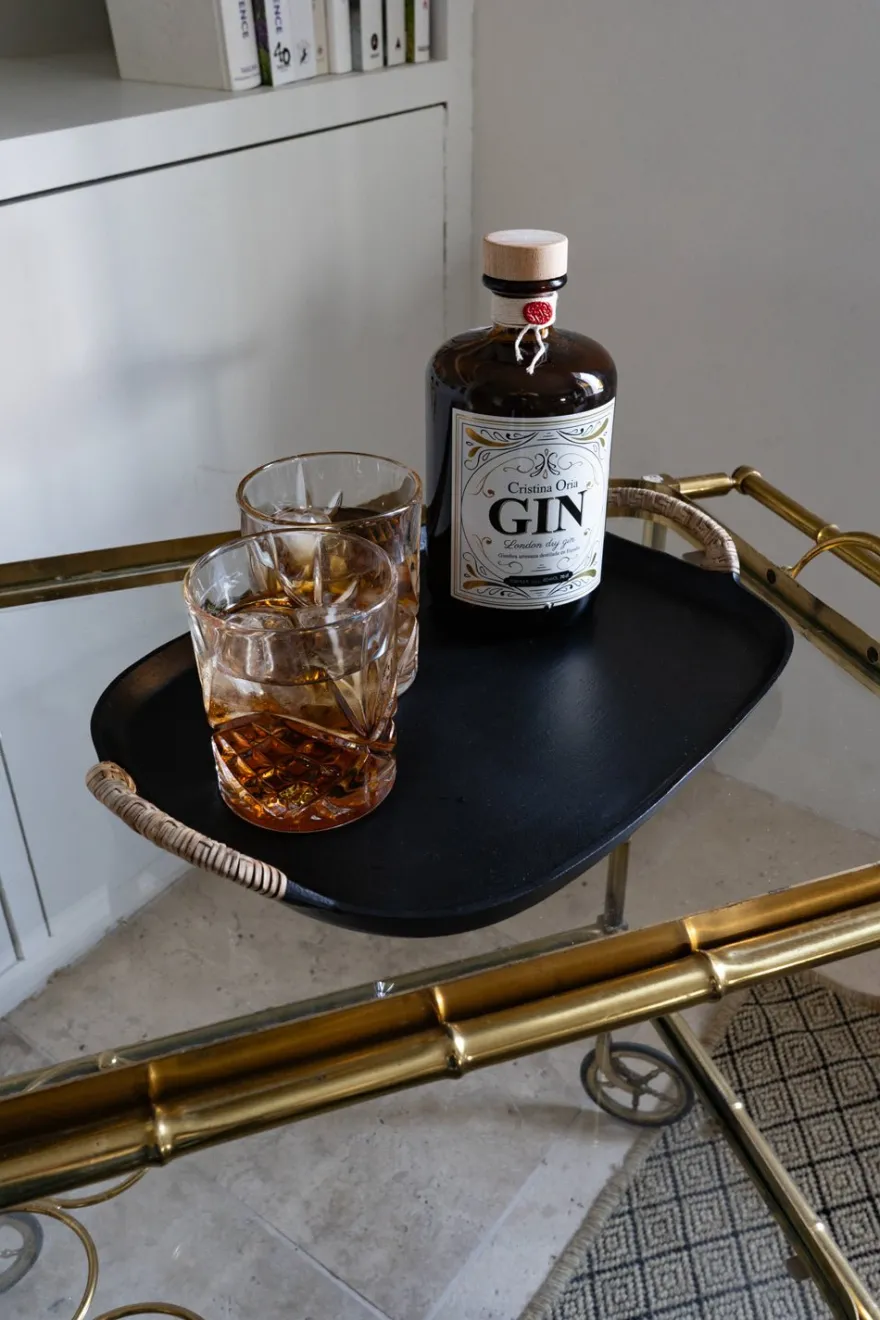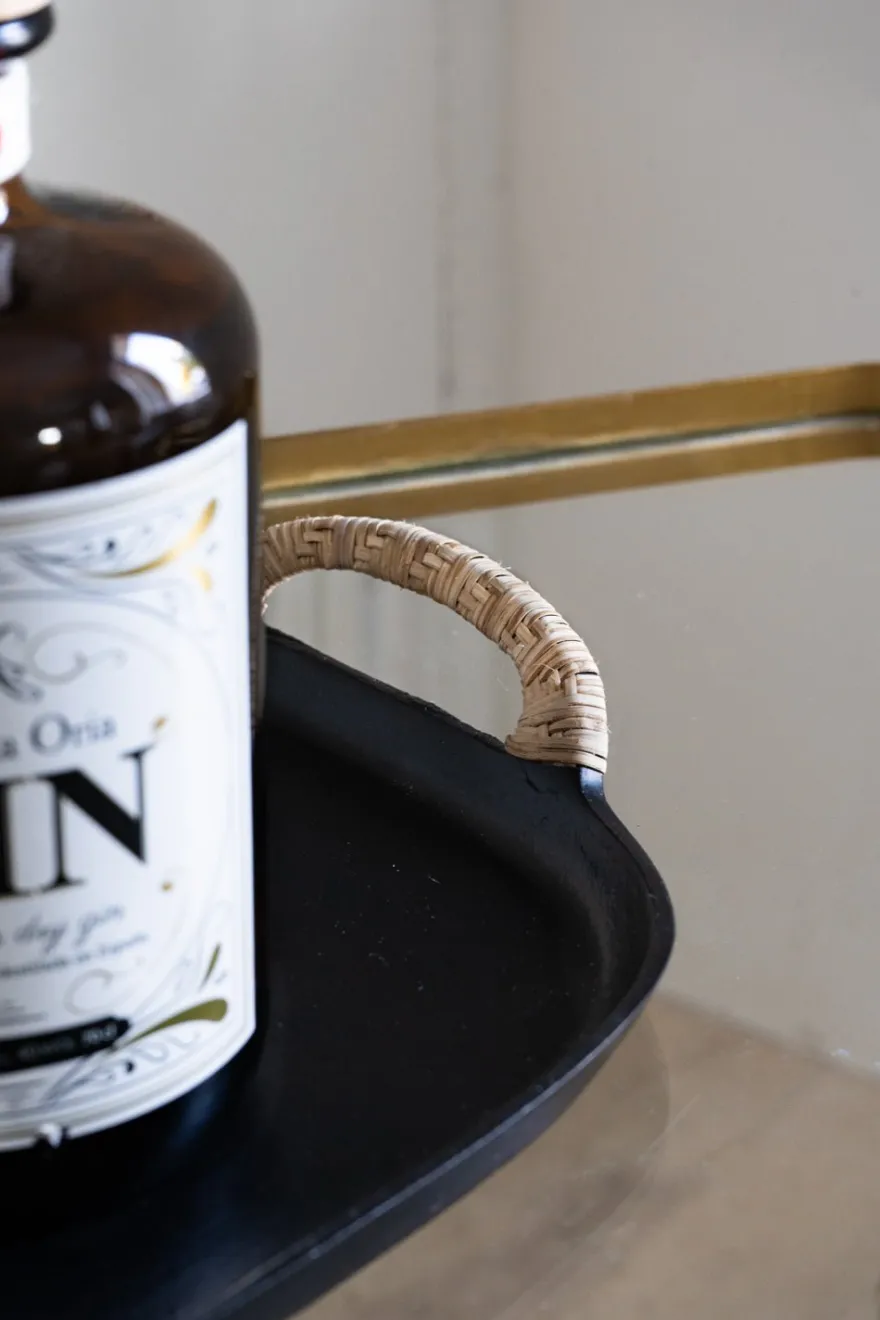 Bandeja rectangular de aluminio negra con asas recubiertas de mimbre. Su acabado mate aporta un toque sofisticado a cualquier mesa o celebración. También es ideal para usar como objeto decorativo.