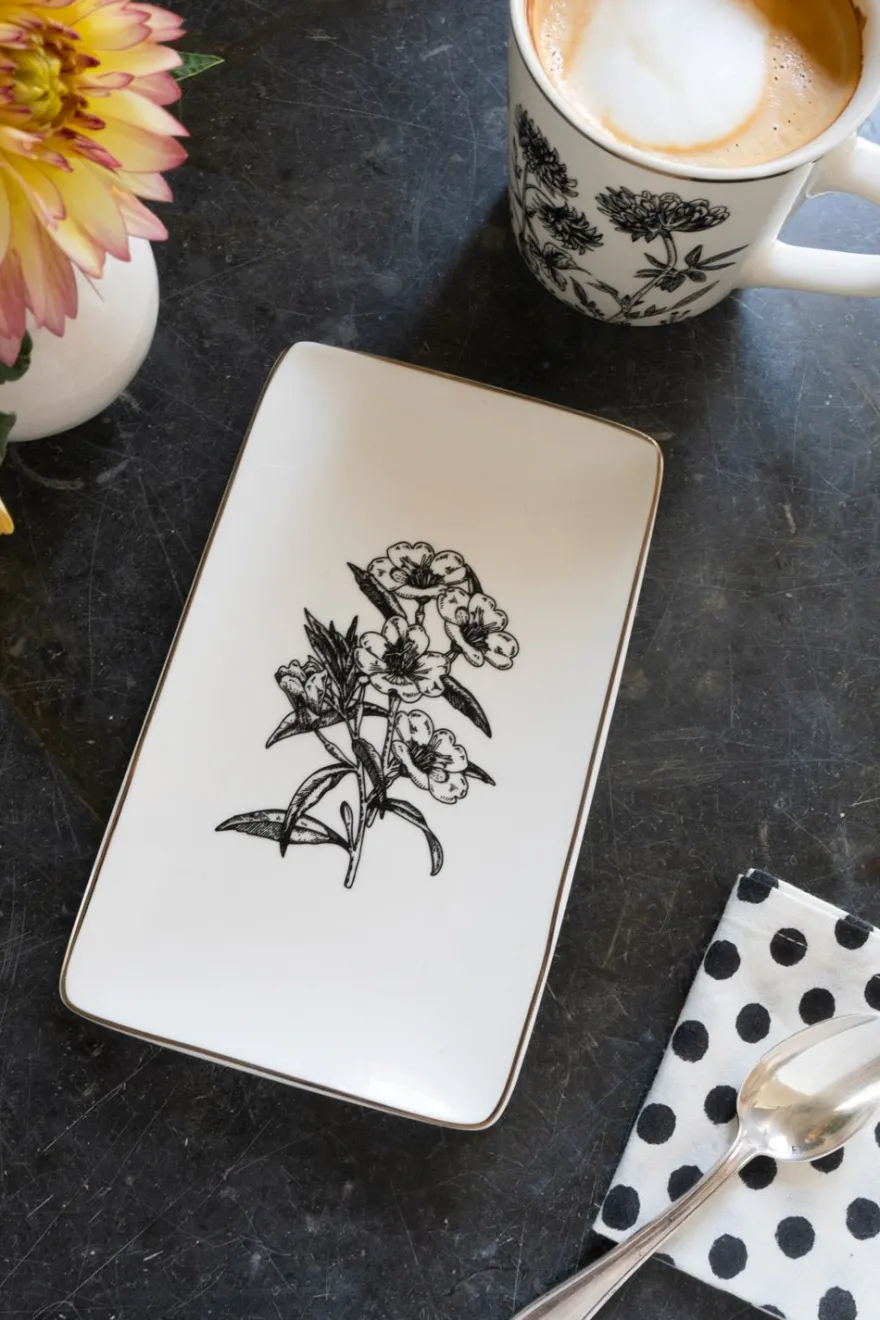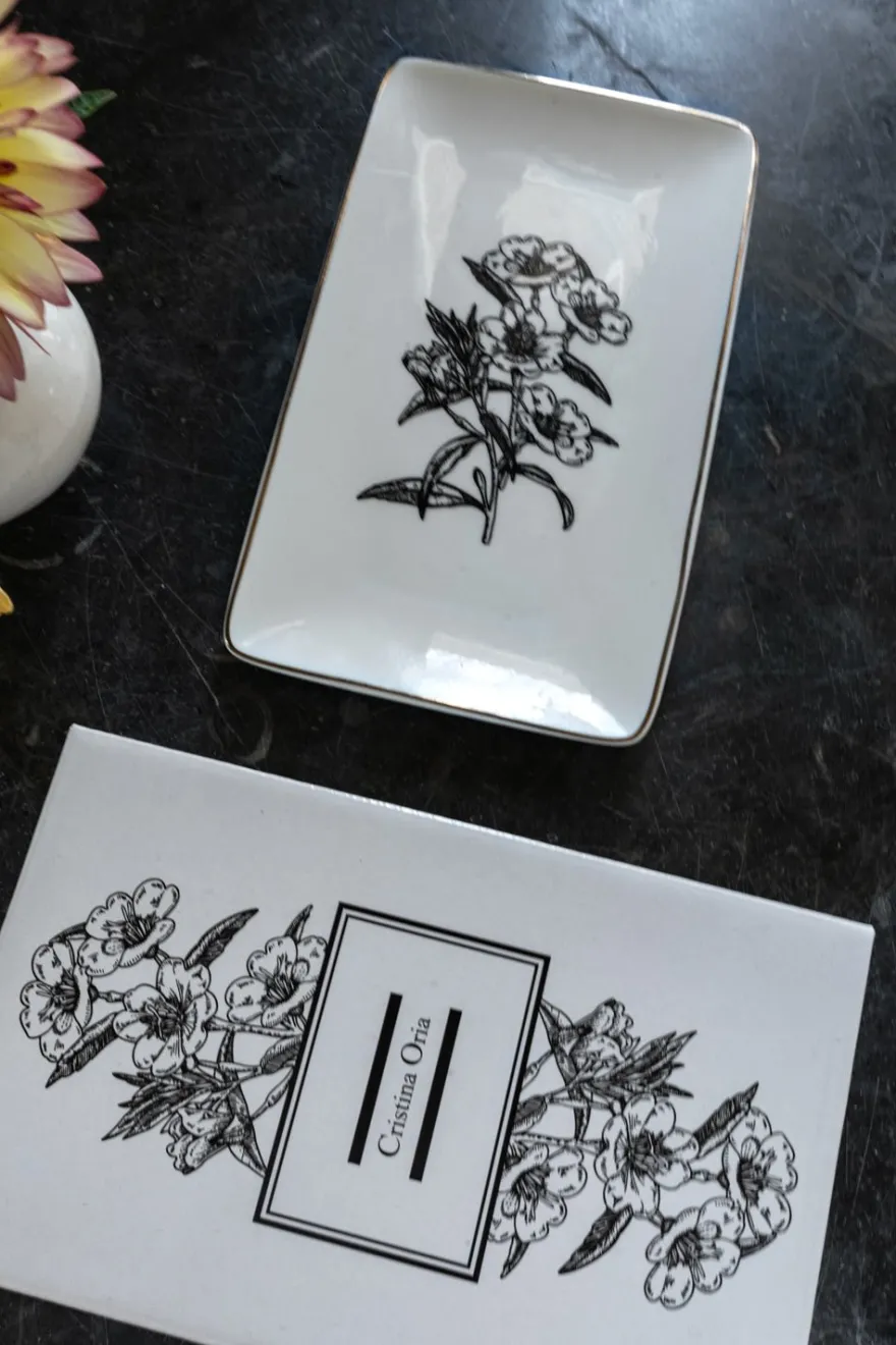 Bandeja negra y blanca con diseño de flores y delicado filo dorado decorando, ideal para servir y realzar cualquier mesa o espacio.