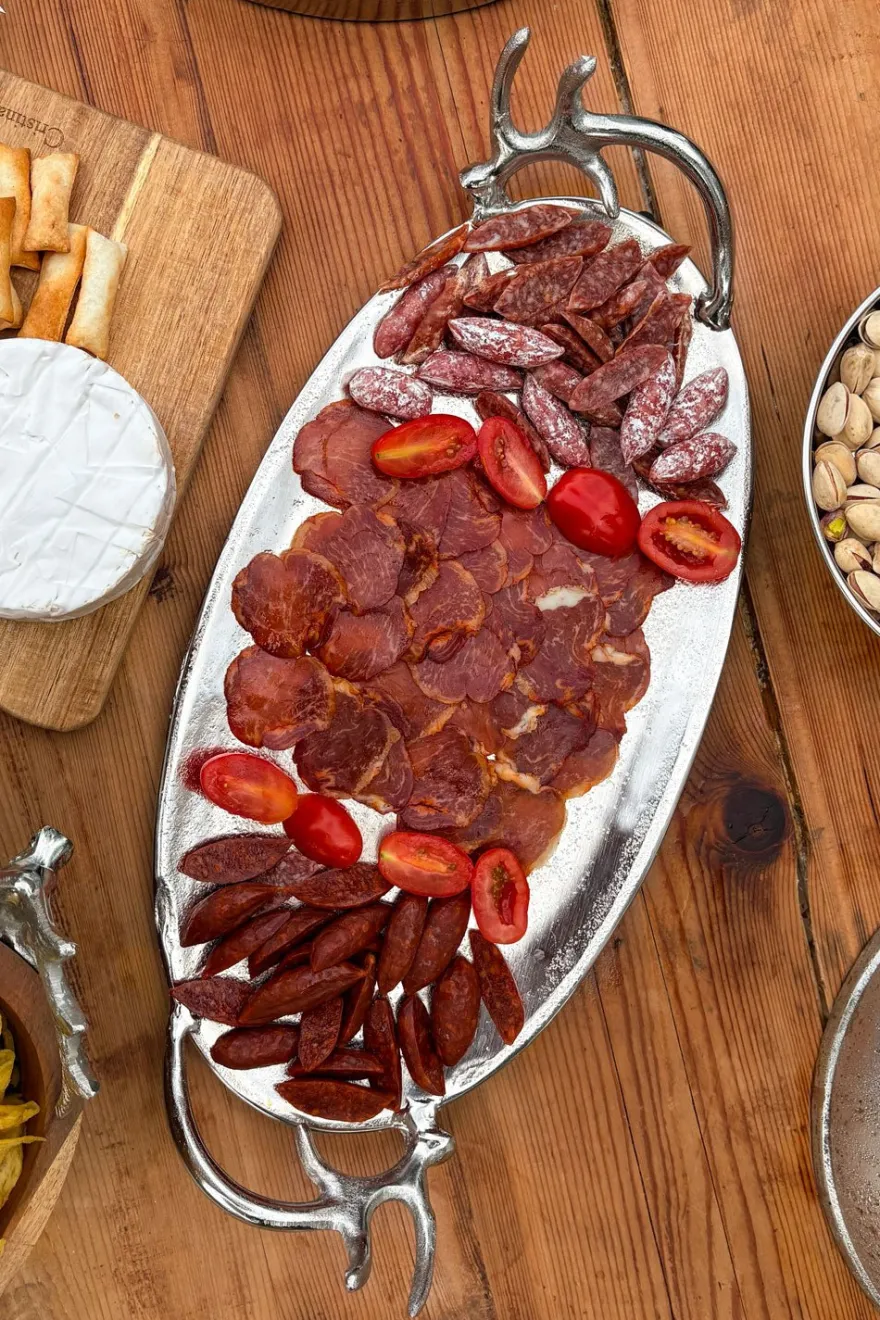 Bandeja oval plateada con asas ornamentadas en forma de cuernos de ciervo, que aportan un toque sofisticado y rústico a la vez. Su acabado plateado le da un toque elegante y moderno, perfecto tanto para decorar como para usar en la mesa.