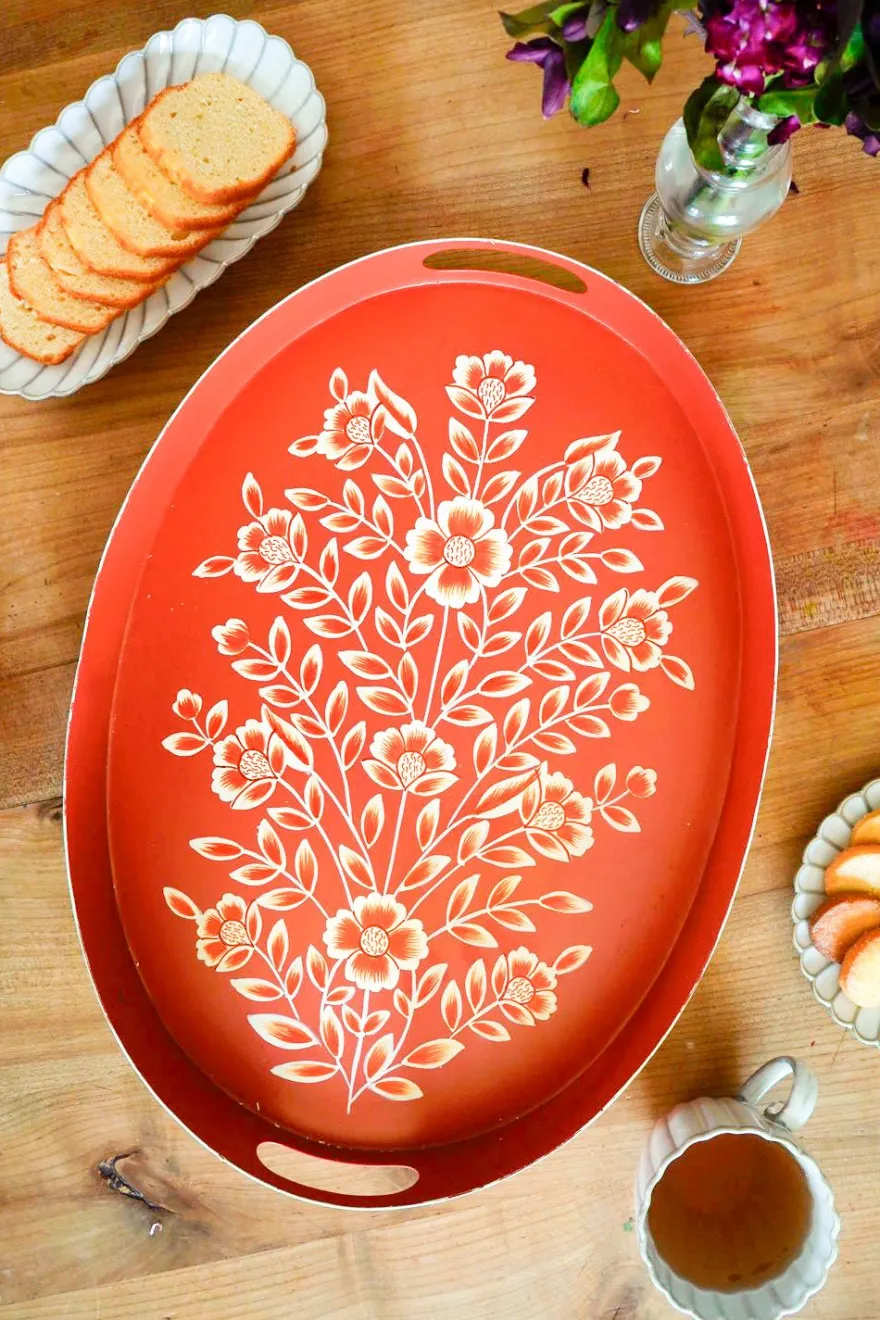 Bandeja ovalada de color teja con flores blancas pintadas a mano, ideal para decorar y dar un toque de estilo a cualquier rincón de tu casa.