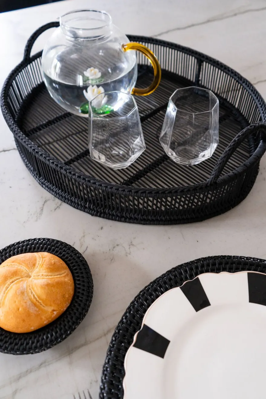 Bandeja ovalada negra con asas de bambú, ideal para interiores y exteriores e incluso para el campo.