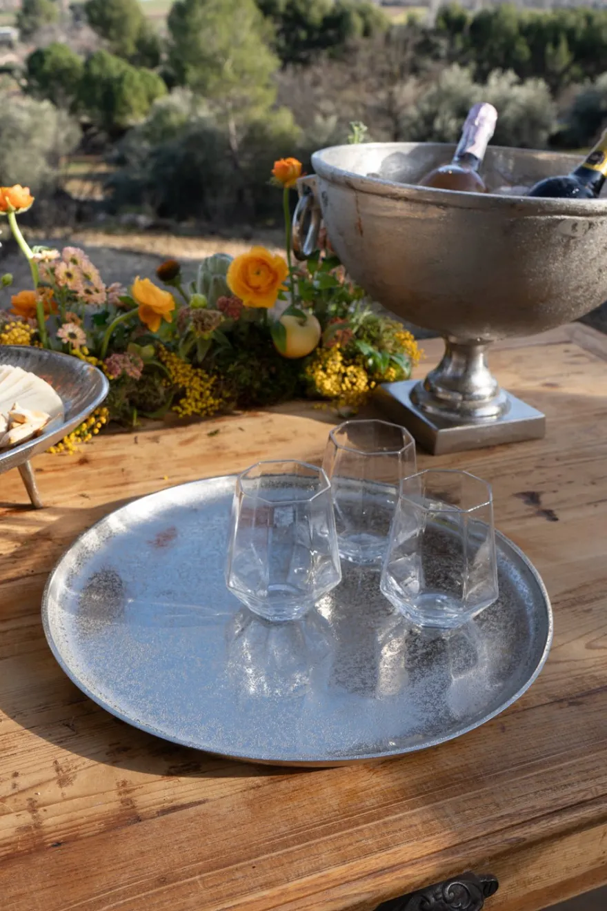 Bandeja redonda de aluminio, ideal para complementar tus mesas o incluso para decorar cualquier rincón de tu casa.