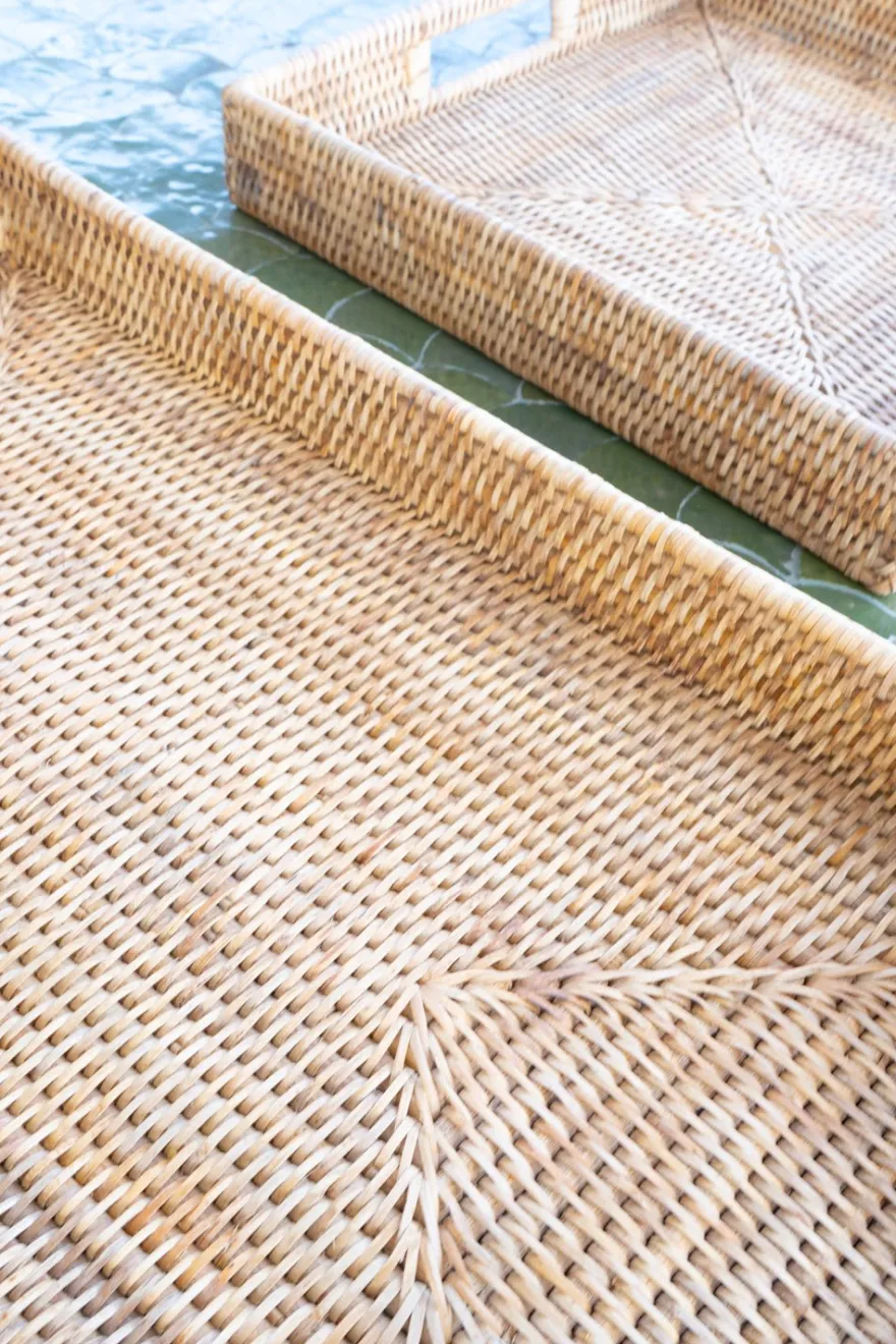 Bandeja rectangular de ratán con asas, ideal para servir con estilo, organizar tu espacio o como elemento decorativo. Esta colección combina la belleza del material natural con la funcionalidad y el diseño contemporáneo.
