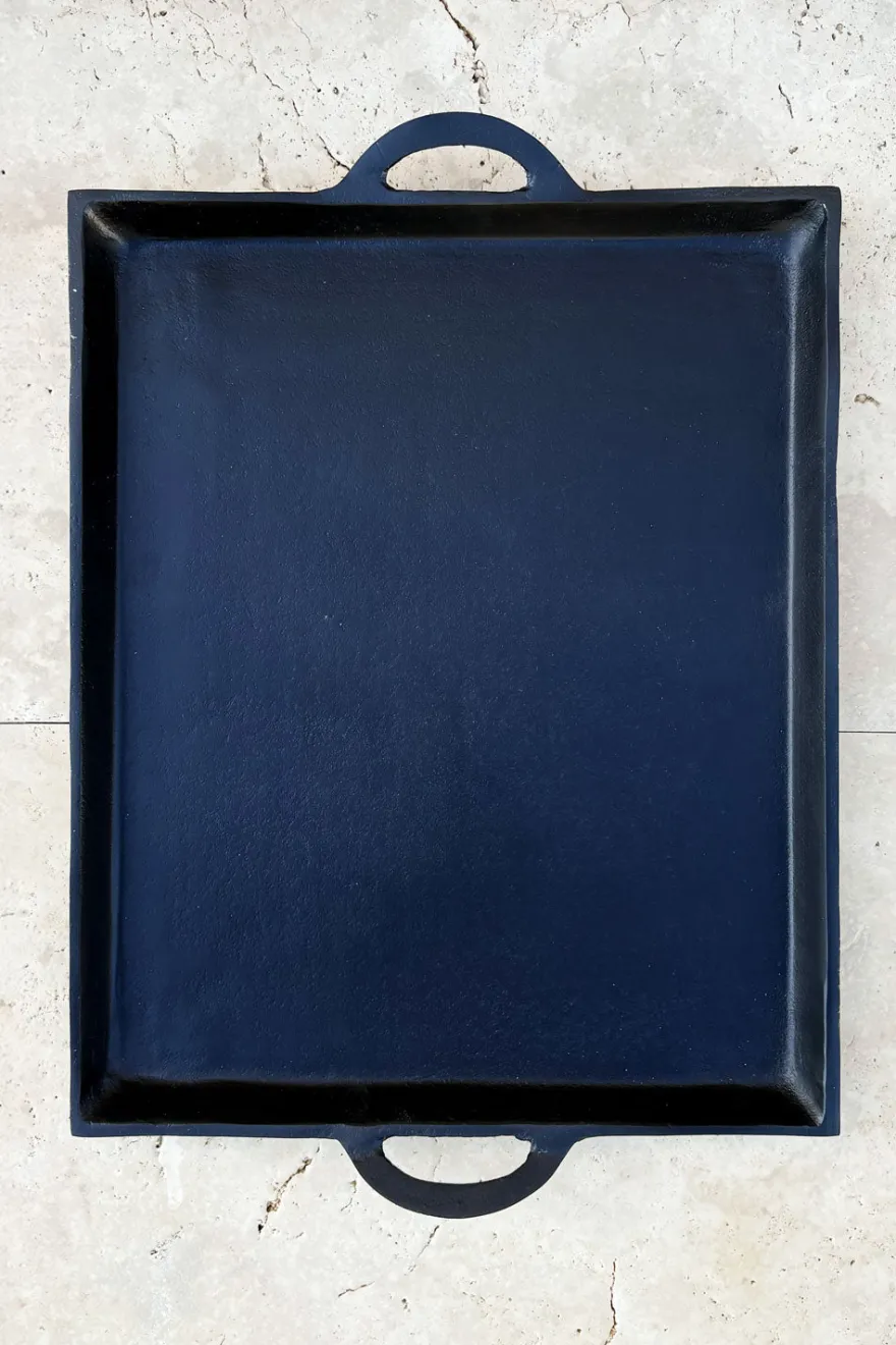 Esta bandeja de aluminio en acabado negro combina estilo y funcionalidad a la perfección. Su diseño sobrio y elegante, junto con las prácticas asas laterales, la convierte en el accesorio ideal para servir con comodidad o para usar como elemento decorativo.