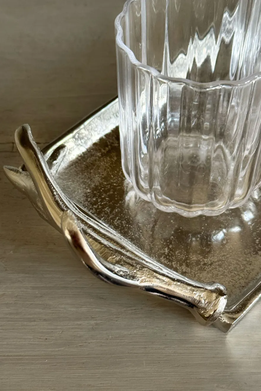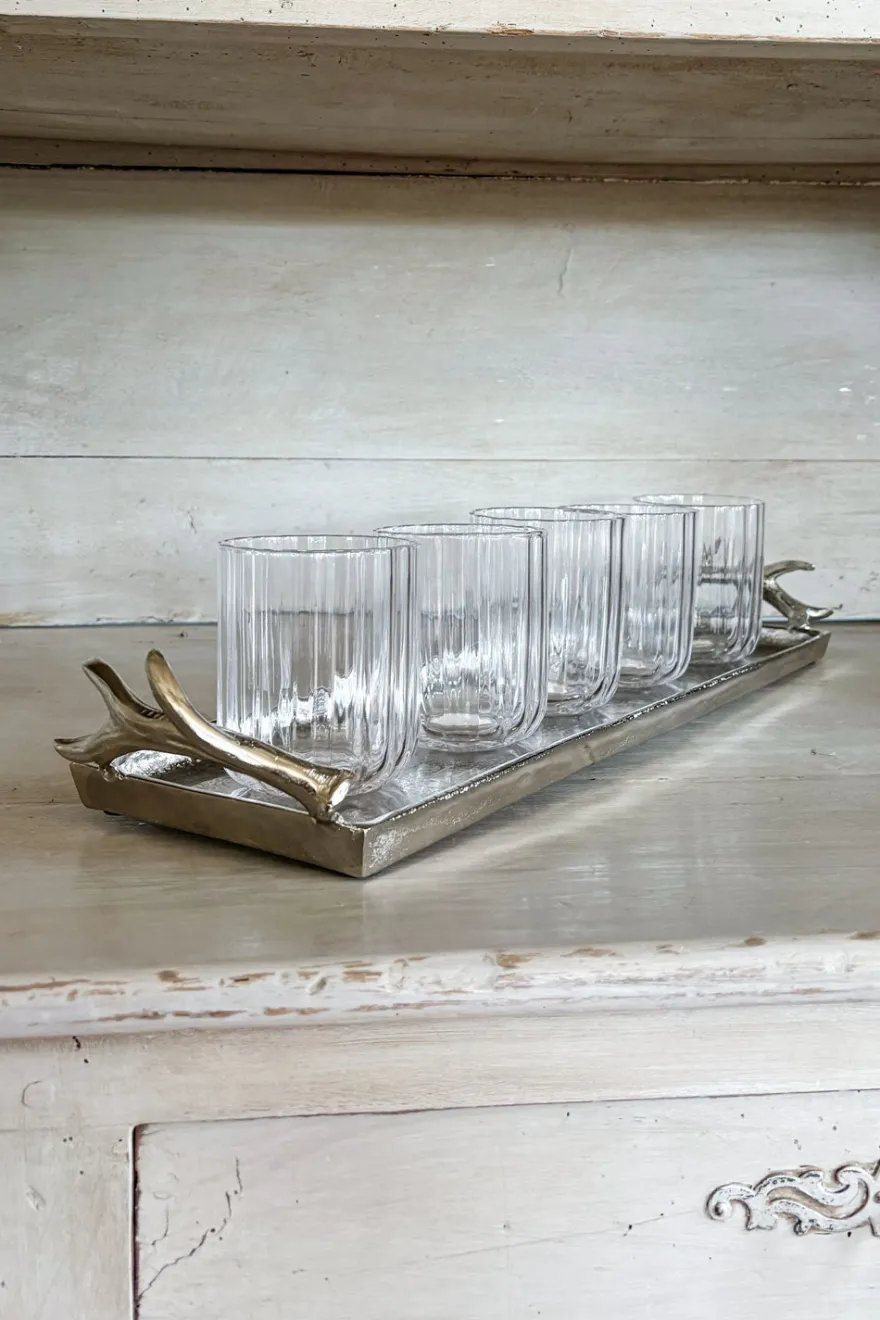 Bandeja rectangular plateada con asas ornamentadas en forma de cuernos de ciervo, que aportan un toque sofisticado y rústico a la vez. Su acabado plateado le da un toque elegante y moderno, perfecto tanto para decorar como para usar en la mesa.