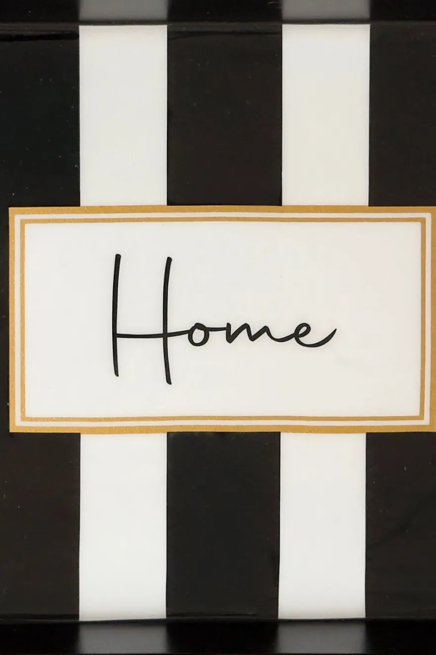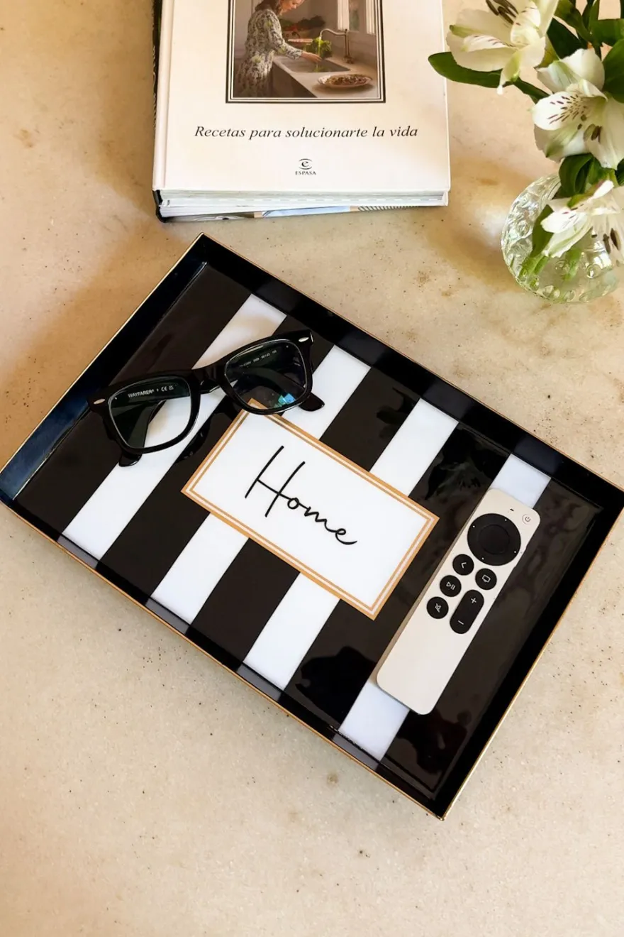 Bandeja rectangular de metal, cuidadosamente barnizada para lograr un acabado brillante que resalta sus detalles. Pintada a mano con un diseño de rayas blancas y negras, y mensaje «Home», además de delicados acabados dorados.