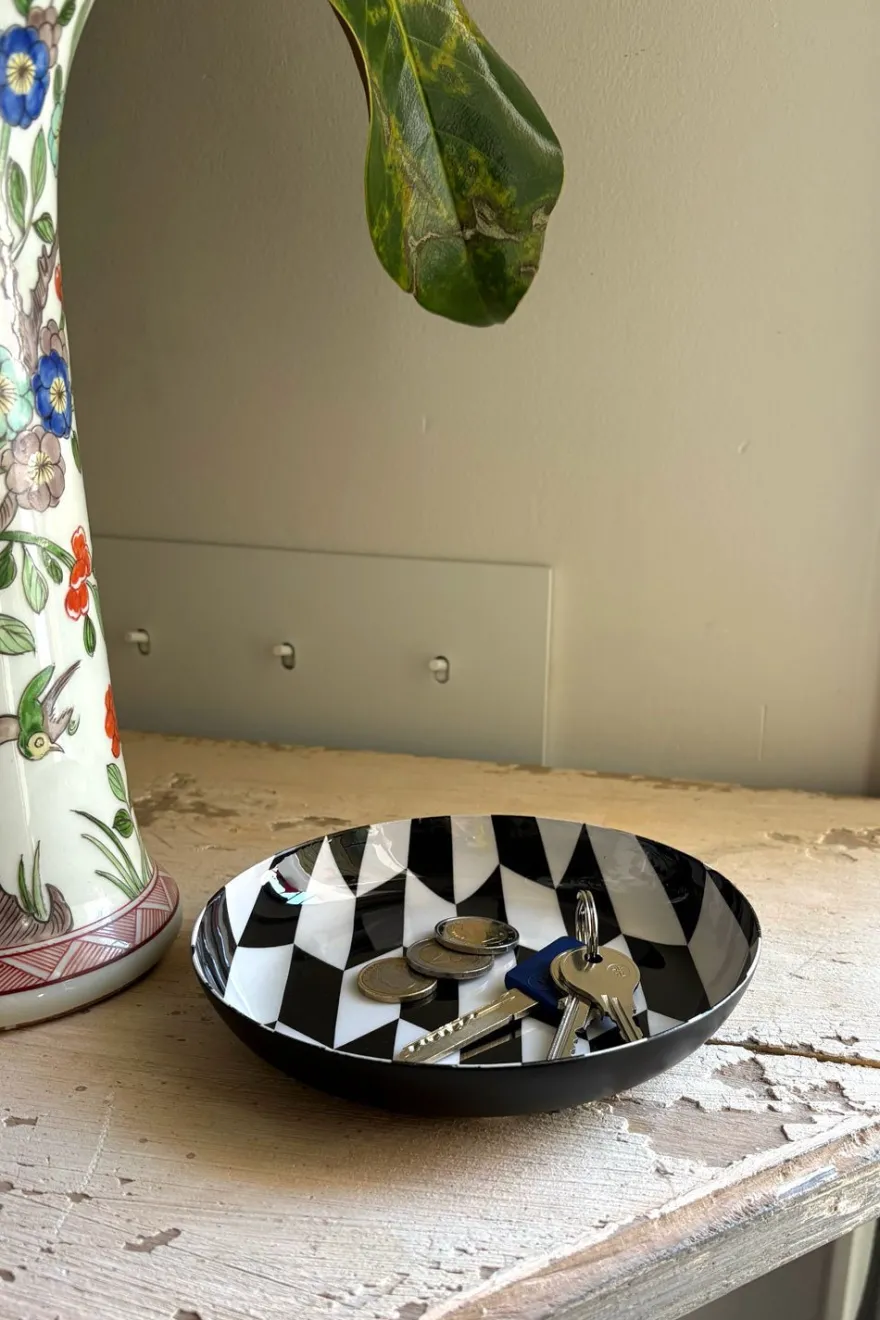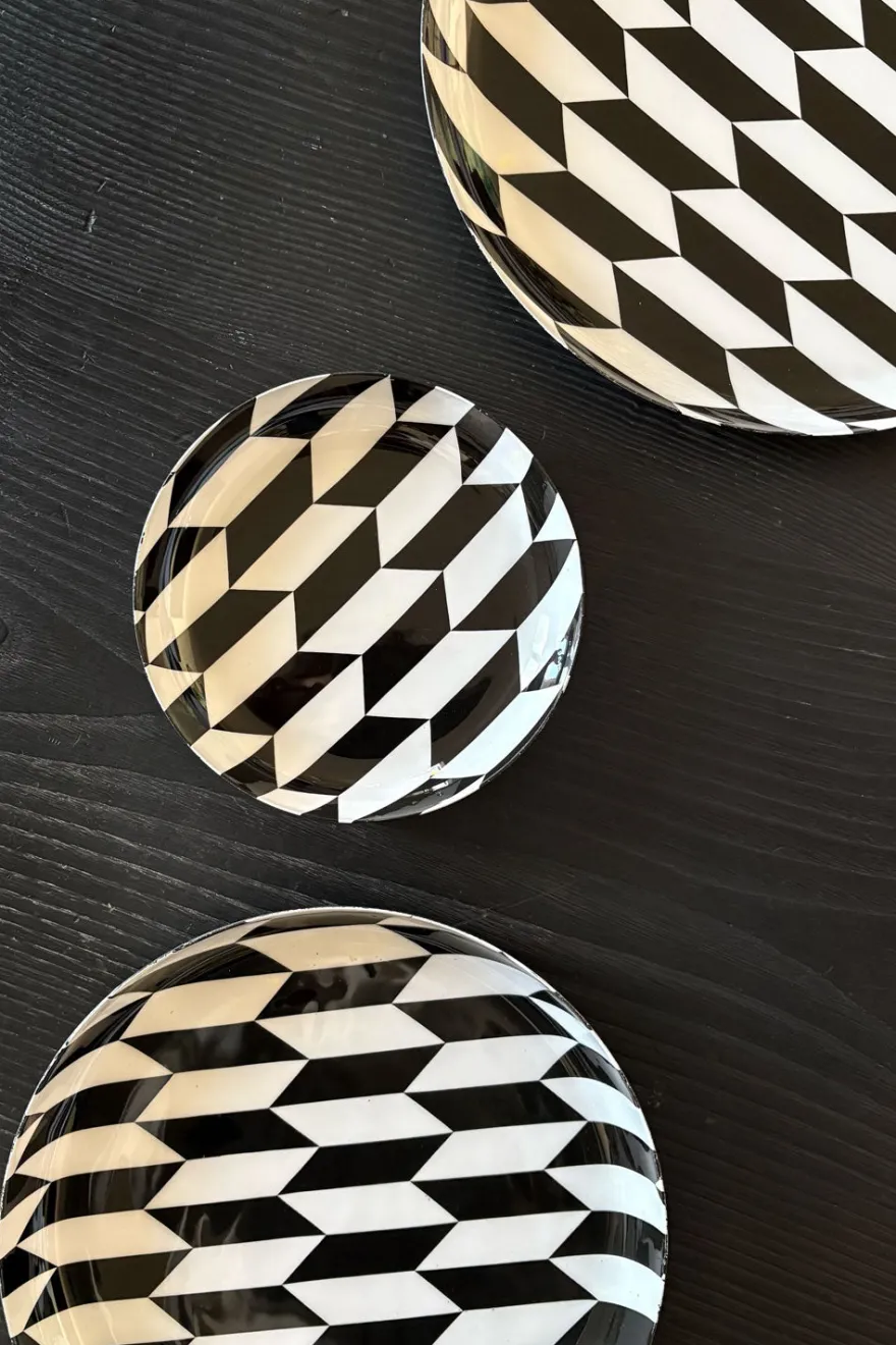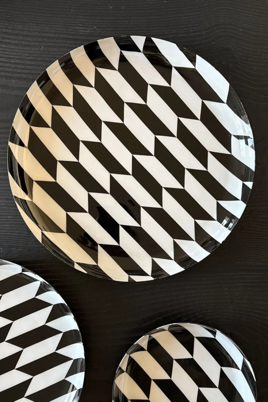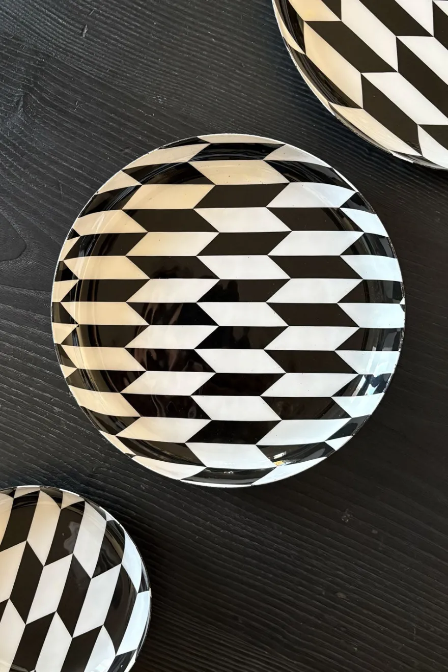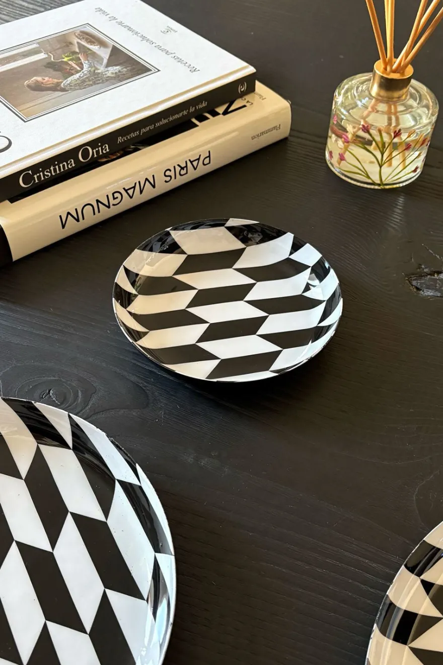 Bandeja decorativa de hierro con acabado esmaltado en blanco y negro, con un diseño geométrico de inspiración moderna que aporta dinamismo y elegancia. Su superficie brillante y su cuidada terminación la convierten en un complemento decorativo versátil y atemporal.