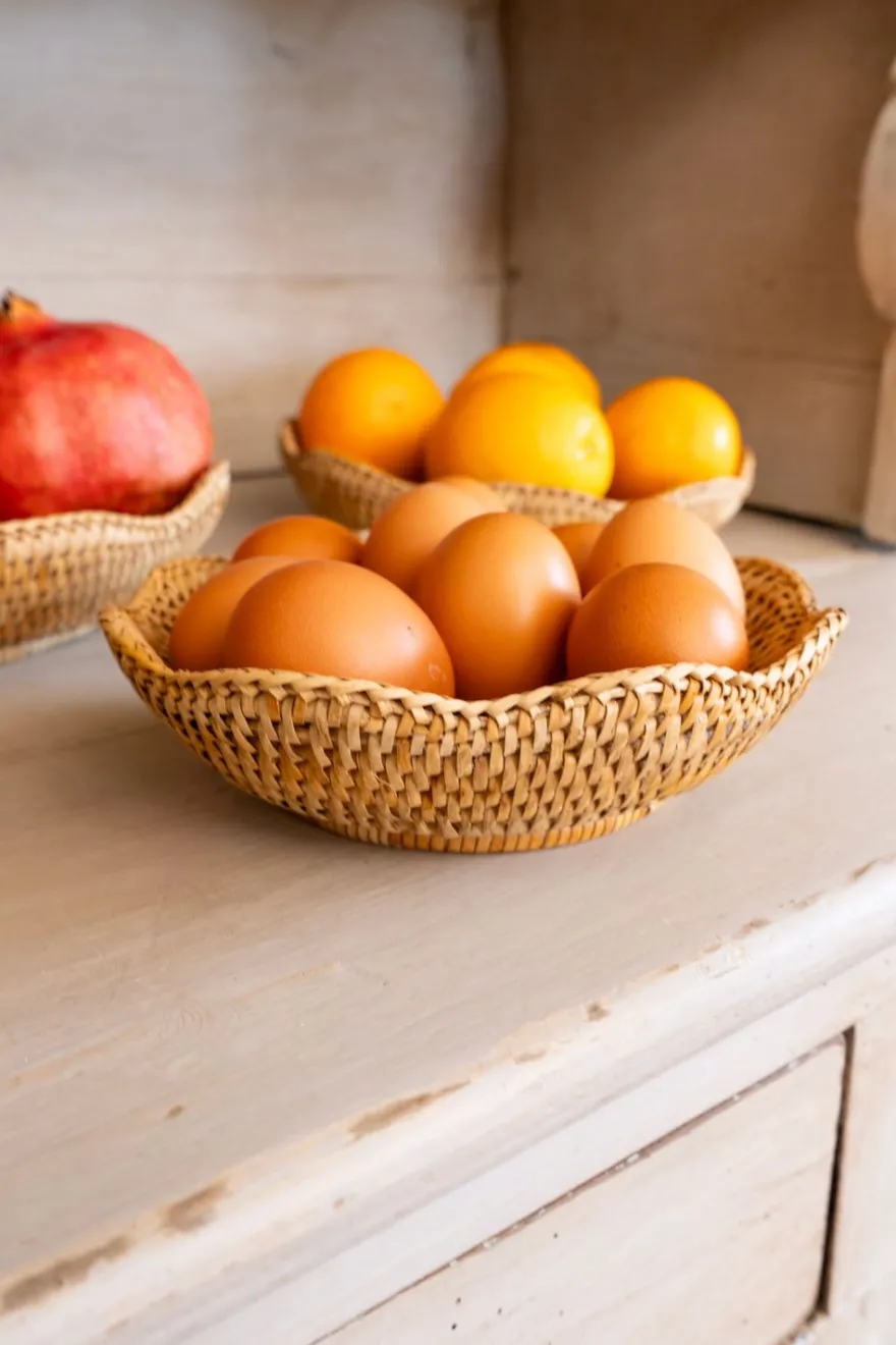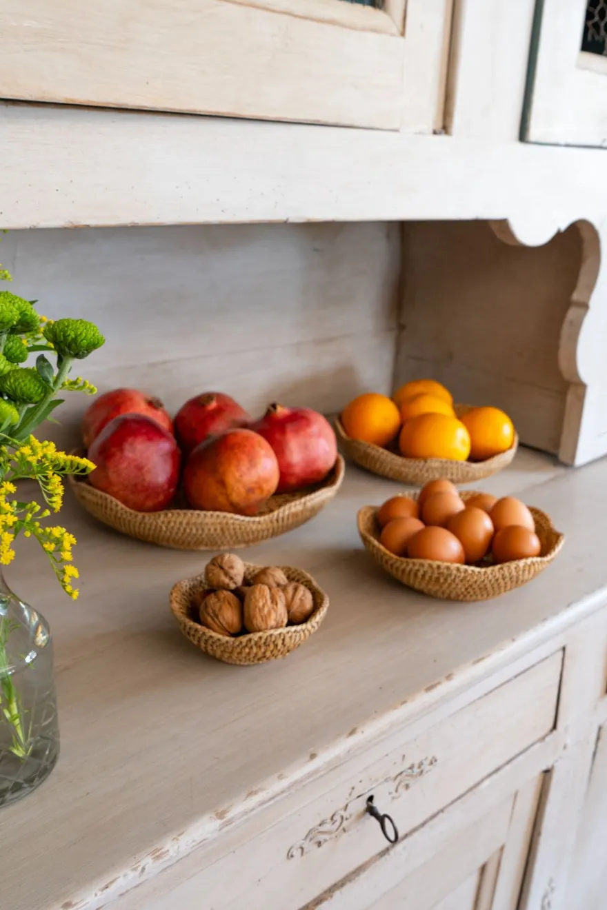 Original bandeja redonda de ratán con borde ondulado, ideal para servir con estilo, organizar tu espacio o como elemento decorativo. Esta colección combina la belleza del material natural con la funcionalidad y el diseño contemporáneo.