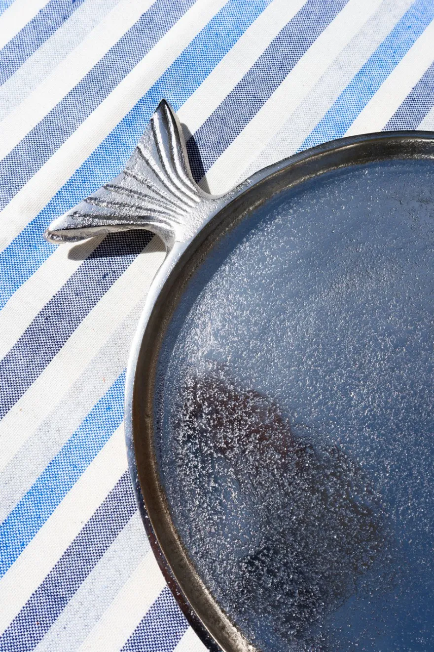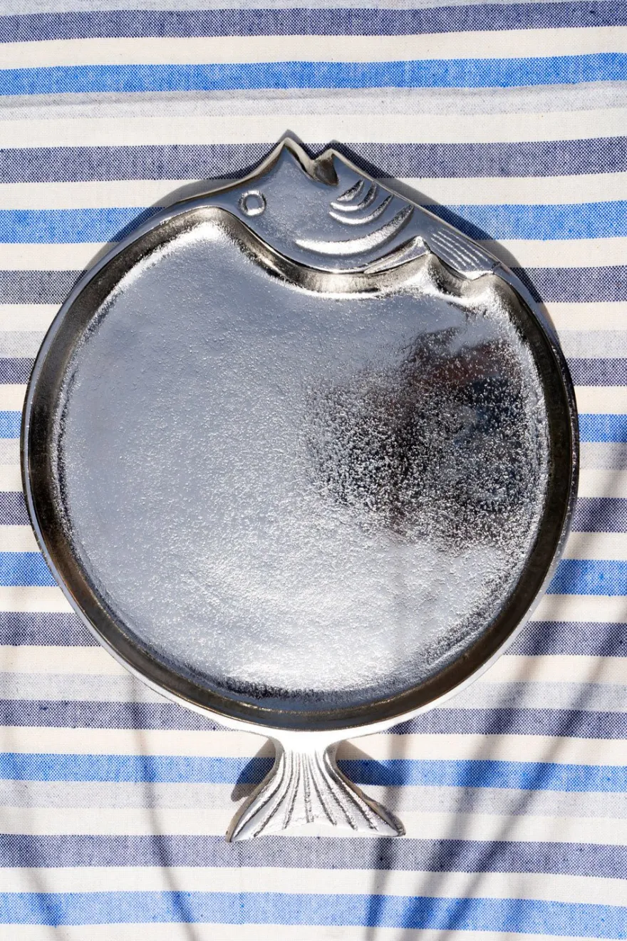 Bandeja redonda plateada con diseño de pez, disponible en dos tamaños diferentes a elegir.