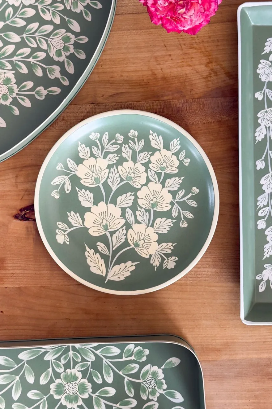 Cristina Oria Bandejas^Bandeja Redonda Verde Con Flores Blancas Pintadas A Mano