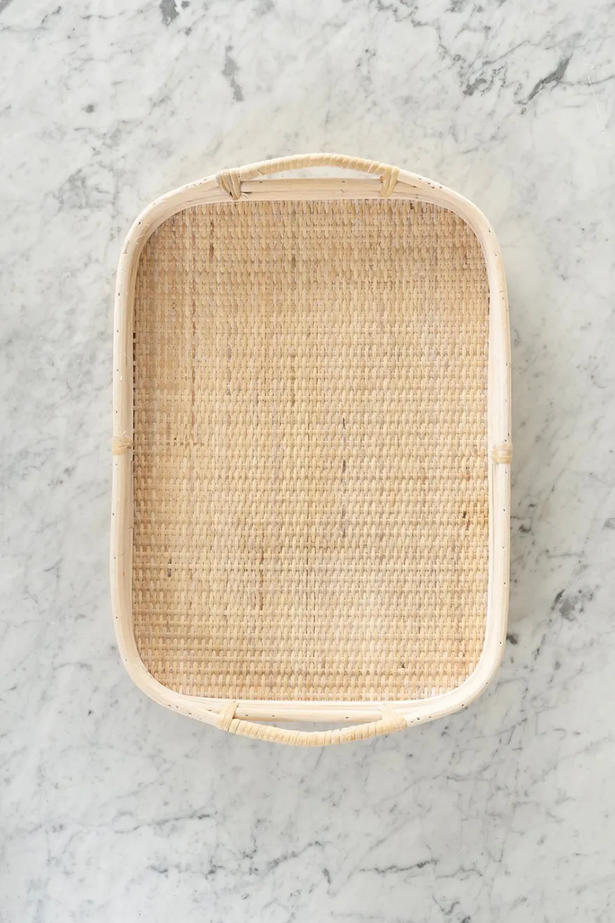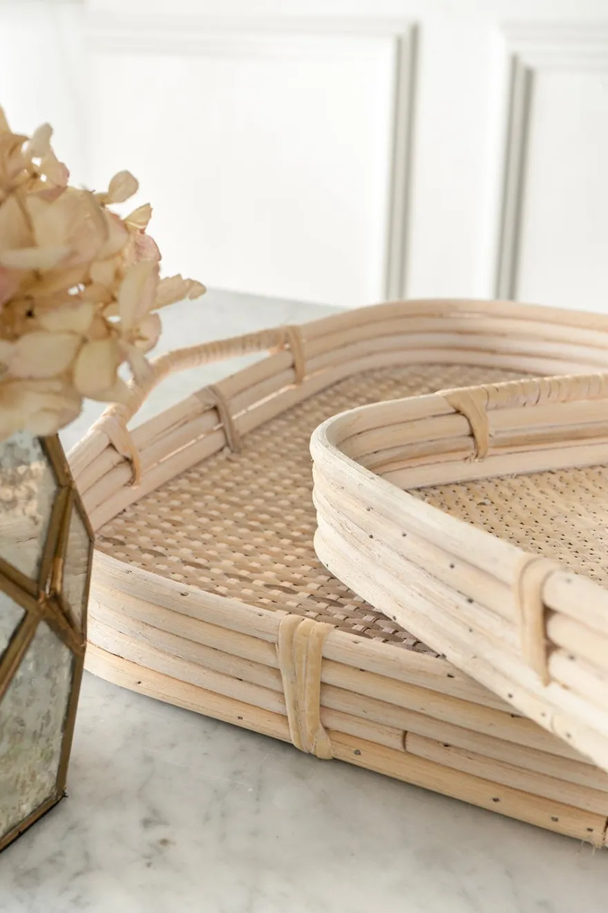 Bandejas rectangulares de ratán natural con asas, versátiles y perfectas para servir o incluso pueden usarse como centros de mesa.