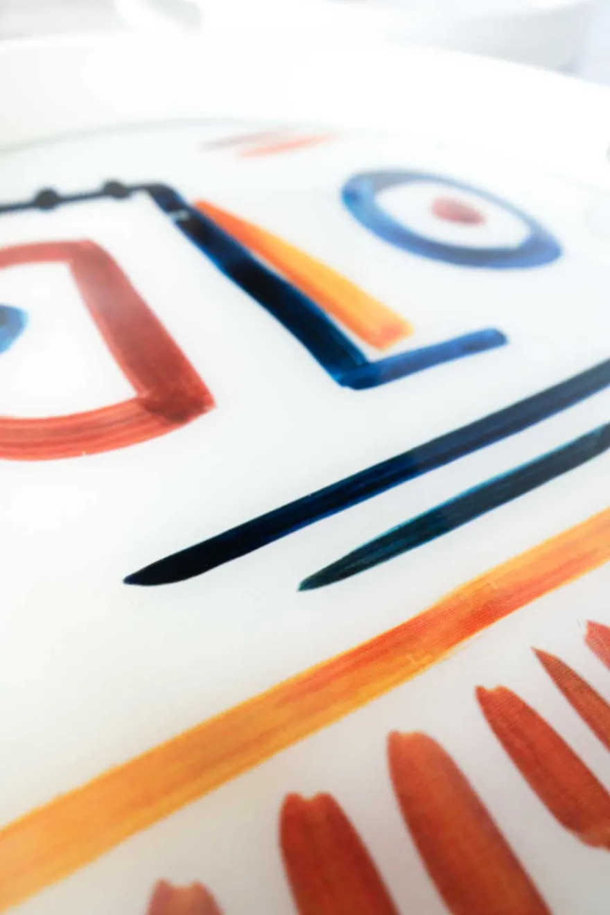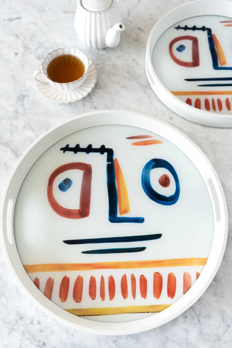 Bandeja redonda con asas de cerámica esmaltada de la colección Picasso, llamativa y diferente, ideal para avivar cualquier espacio.
