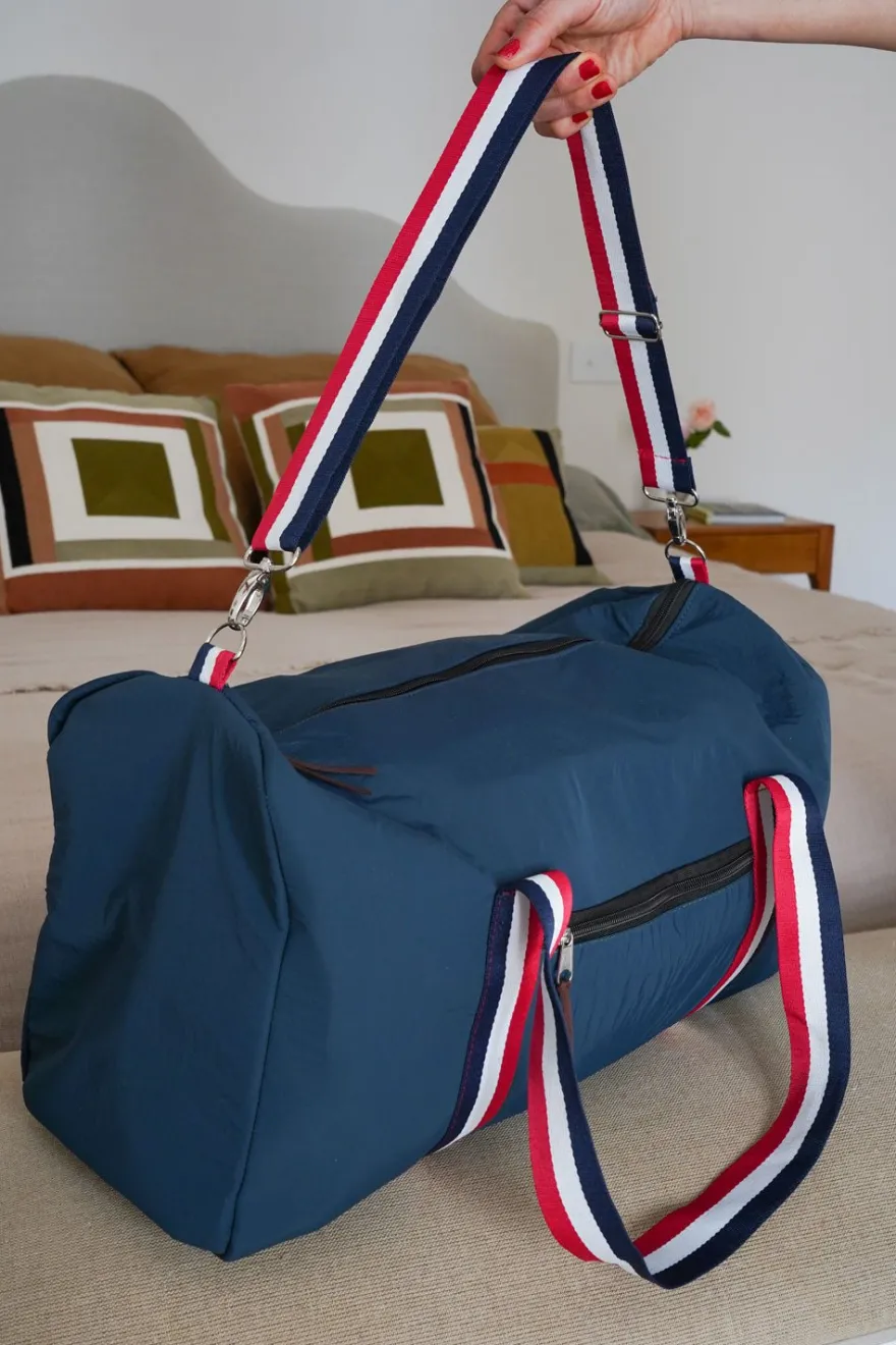 Tiene un espacio amplio para ropa, calzado y accesorios, además de un bolsillo frontal, y asas reforzadas y correa ajustable para llevarla al hombro o cruzada.