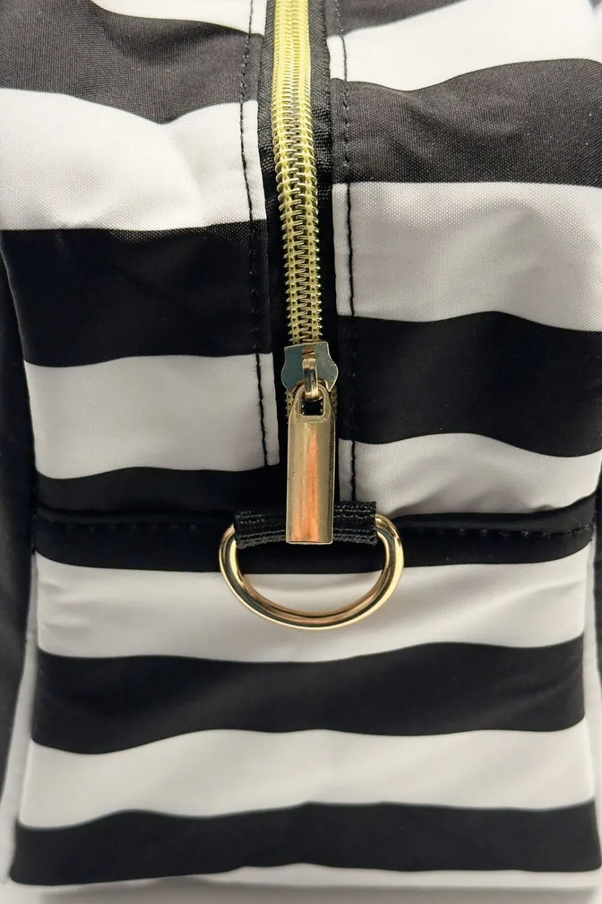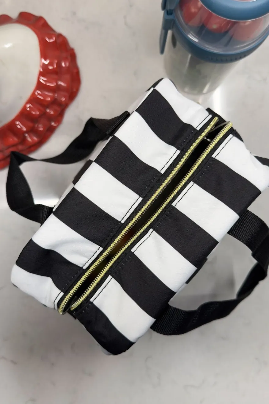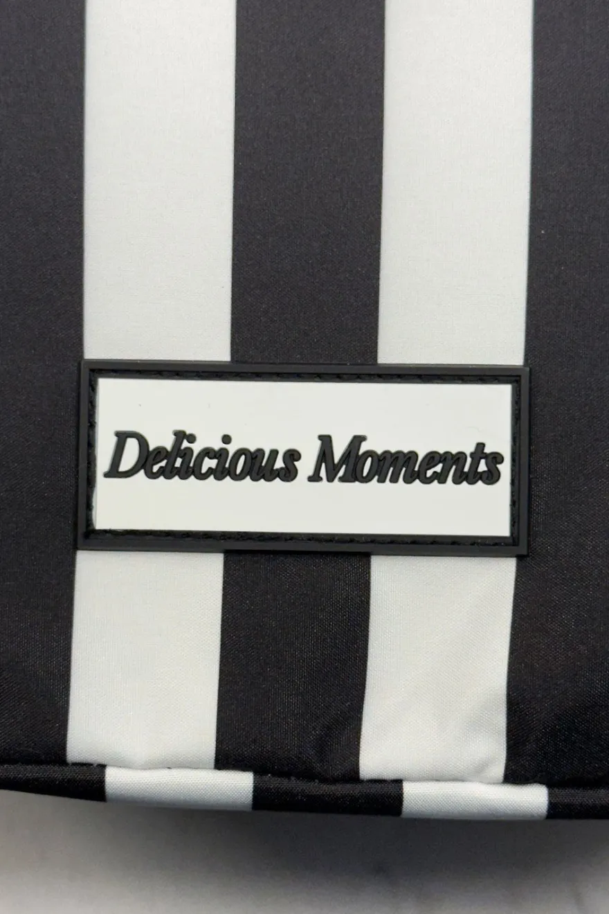 Bolsa térmica con diseño de rayas blancas y negras y el mensaje “Delicious Moments” en la parte frontal. Su estilo elegante y atemporal la hace ideal para llevar comidas, snacks o bebidas tanto al trabajo como a salidas diarias.