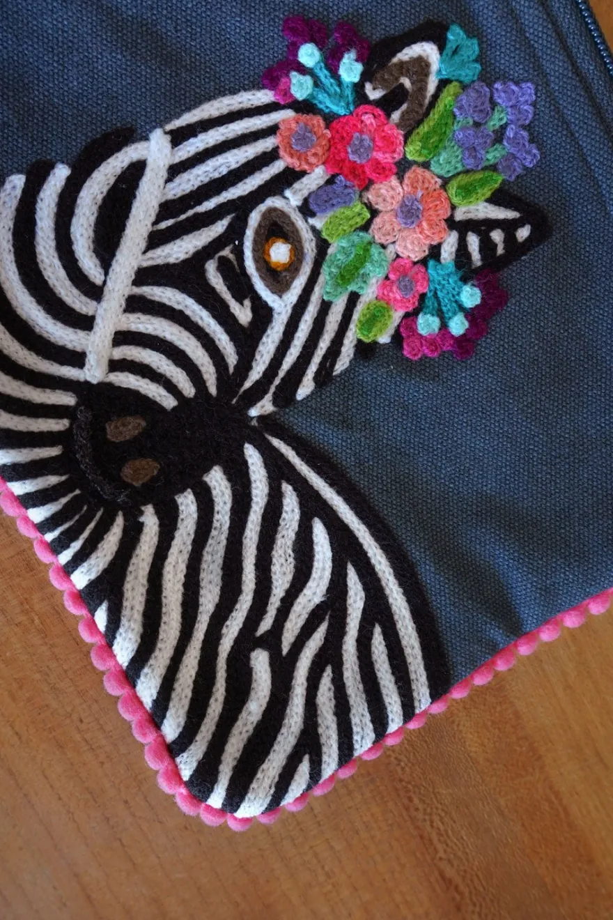 Lleno de color y personalidad, este neceser con diseño de cebra bordado a mano es ideal para llevar lo esencial con estilo y destacar en cualquier ocasión.