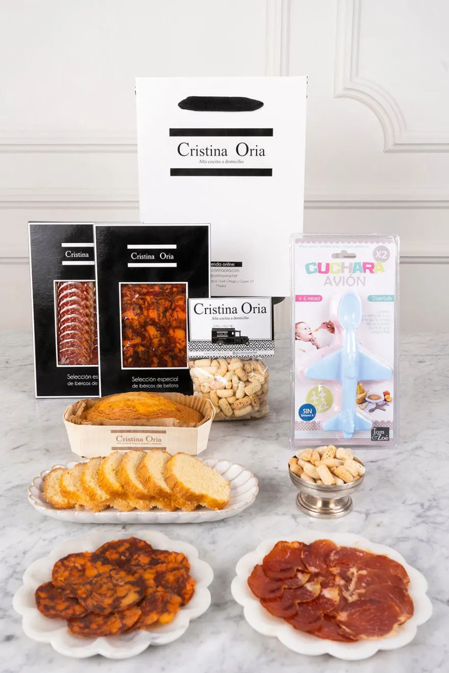 Esta bolsa para regalar a las recién mamás incluye una selección de nuestros productos gourmet que no ha podido tomar durante el embarazo, y una cucharita con forma de avión para las primeras papillas del bebé.