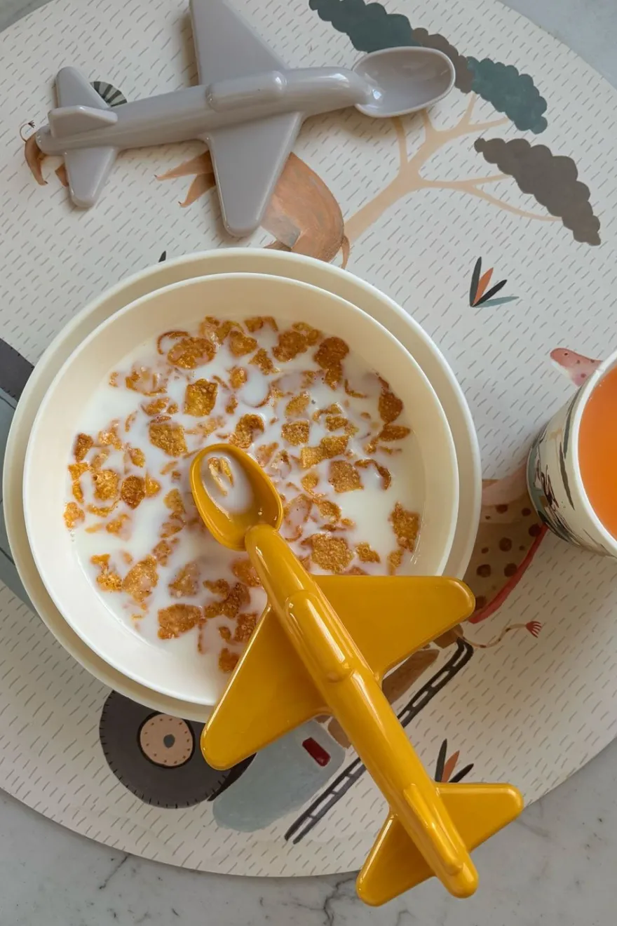 – Set dos cucharas con forma de avión (disponible en color mostaza y en color rosa)