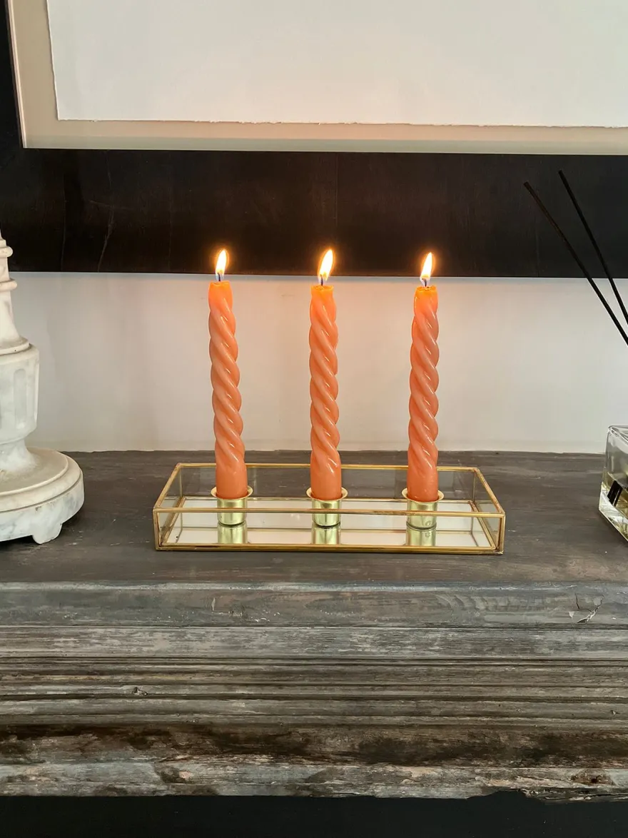 Candelabro/centro de mesa rectangular de cristal con bordes dorados, ideal para decorar cualquier rincón de tu casa.