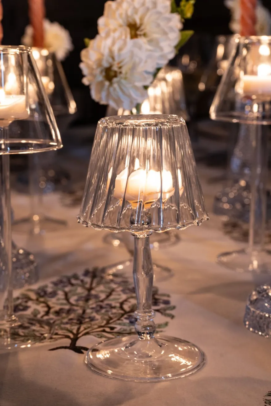 Candelabro o portavelas de cristal transparente con diseño de lámpara y detalles ondulados, ideal y versátil para ambientar y decorar cualquier rincón de casa durante todo el año.