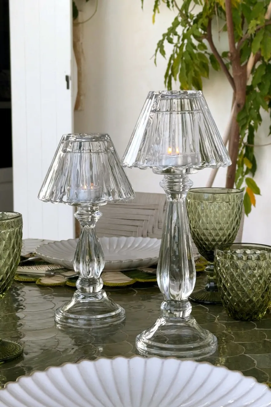 Candelabro o portavelas de cristal transparente con diseño de lámpara y detalles ondulados, ideal y versátil para ambientar y decorar cualquier rincón de casa durante todo el año.