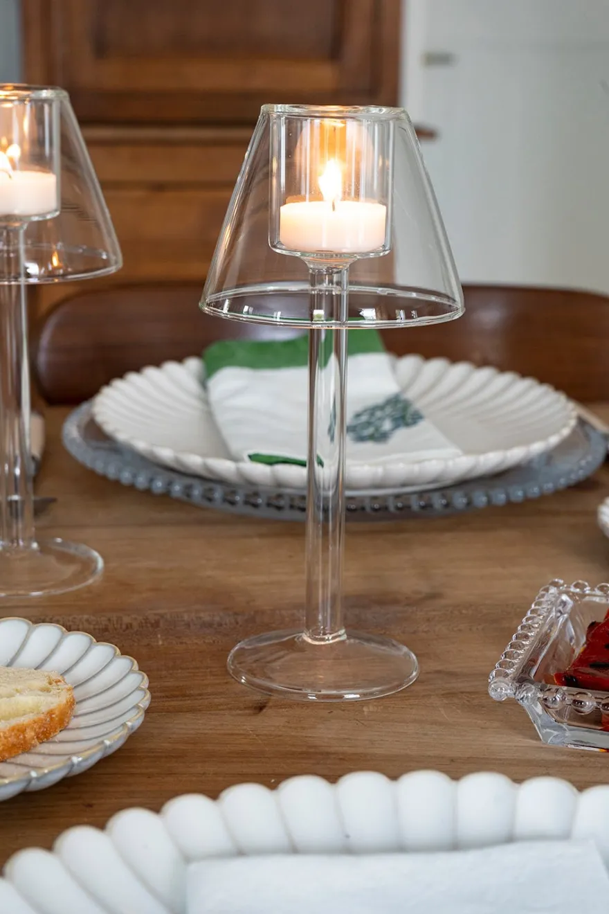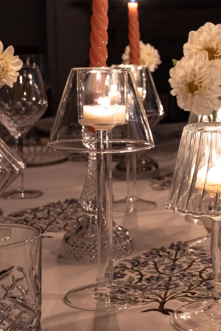 Candelabro o portavelas de cristal transparente con diseño de lámpara, ideal y versátil para ambientar y decorar cualquier rincón de casa durante todo el año.