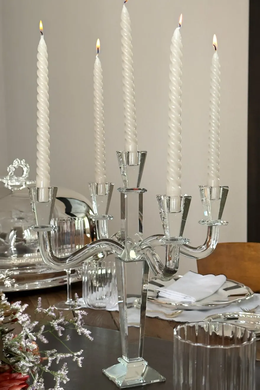 Elegante candelabro de cristal con cinco brazos para velas altas. Su diseño clásico y transparente aporta un toque de distinción y brillo a cualquier rincón. Ideal como centro de mesa o para ambientar cenas y eventos especiales.