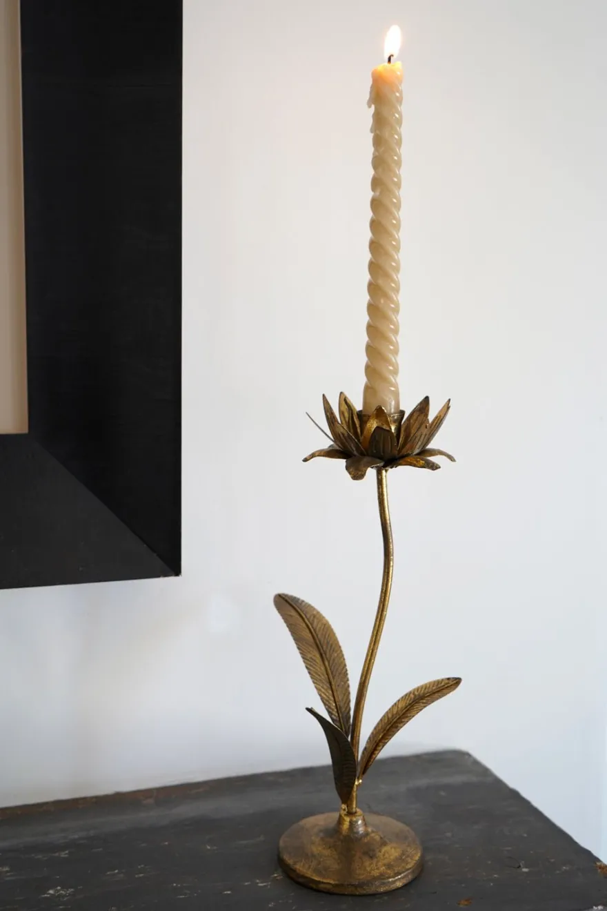 Candelabro de metal de color dorado antiguo con diseño de flor, ideal para dar un aspecto lujoso, elegante y atemporal a cualquier rincón de tu casa, e incluso para colocar como centro de mesa en ocasiones especiales.
