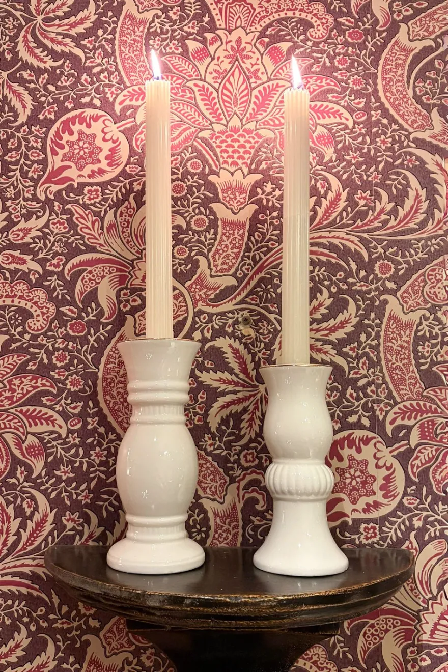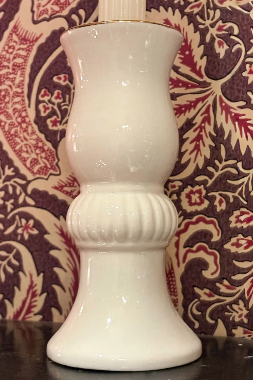 Elegante candelabro de porcelana blanca con un delicado filo dorado que realza su diseño clásico y sofisticado. Su silueta estilizada es ideal para velas altas y finas, aportando luz y distinción a cualquier ambiente, desde mesas formales hasta rincones decorativos especiales.
