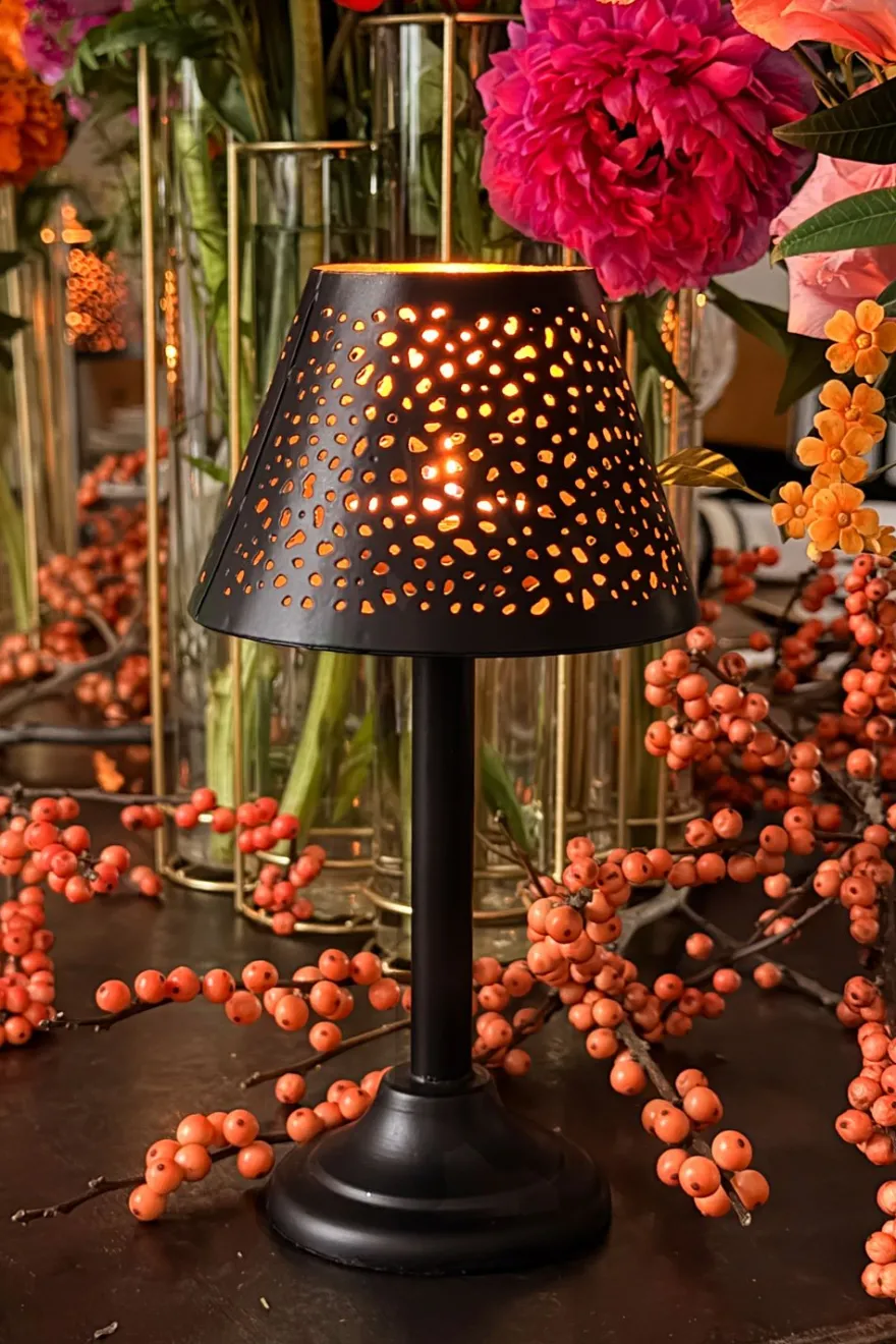 Elegante lámpara de acero en acabado negro mate. El interior dorado de la campana crea un efecto de luz cálido y brillante cuando la vela está encendida, proyectando destellos a través de los orificios del diseño.
