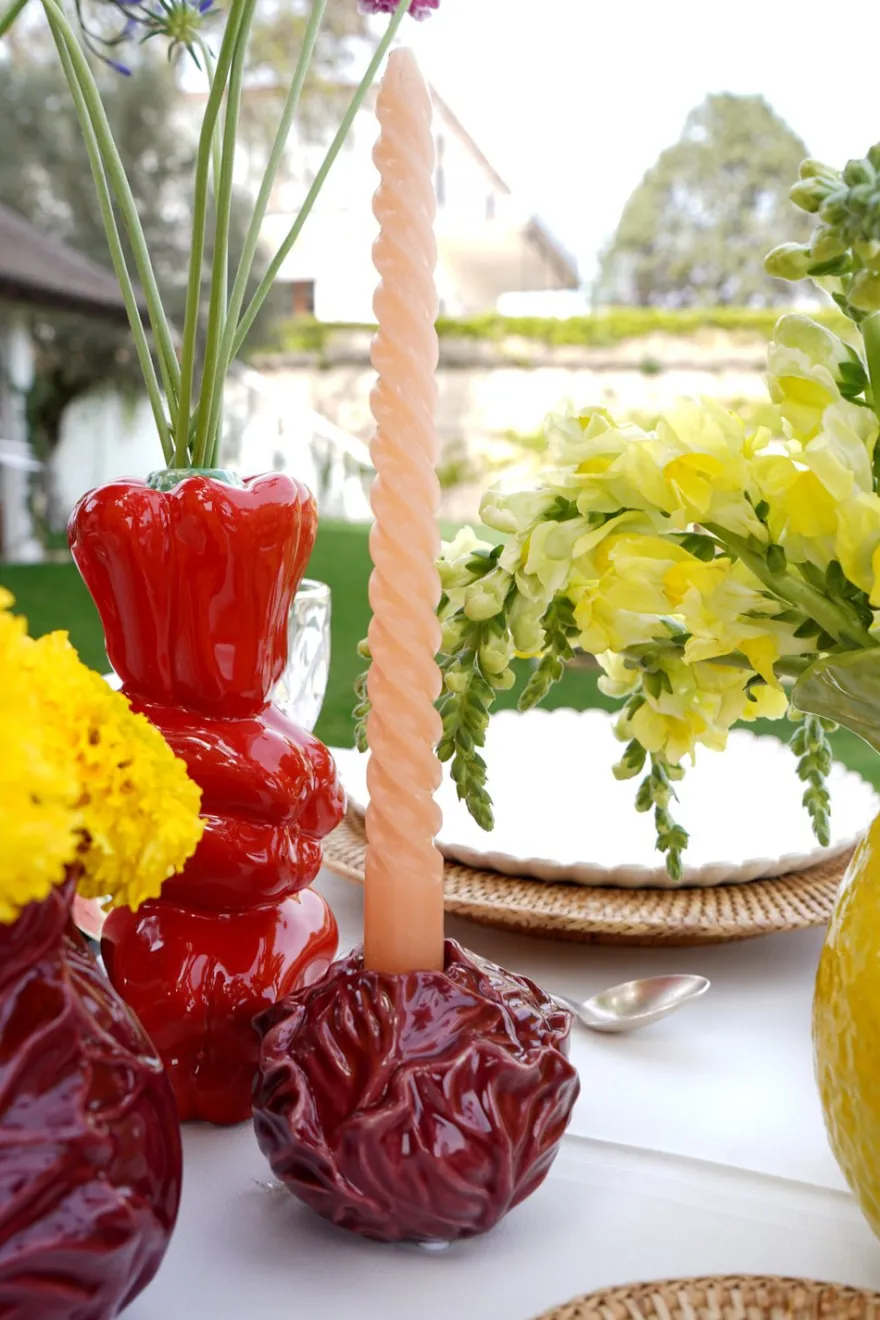 Portavelas de loza fina esmaltada con diseño de col granate,100% artesanal, ideal para complementar y dar un toque fresco, original y diferente a cualquier rincón de tu casa, ya sea interior o exterior.