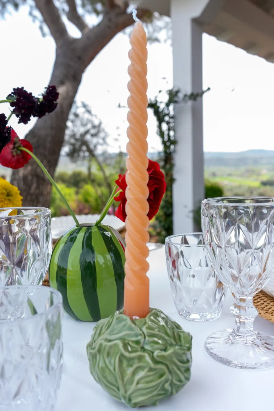 Portavelas de loza fina esmaltada con diseño de col verde,100% artesanal, ideal para complementar y dar un toque fresco, original y diferente a cualquier rincón de tu casa, ya sea interior o exterior.
