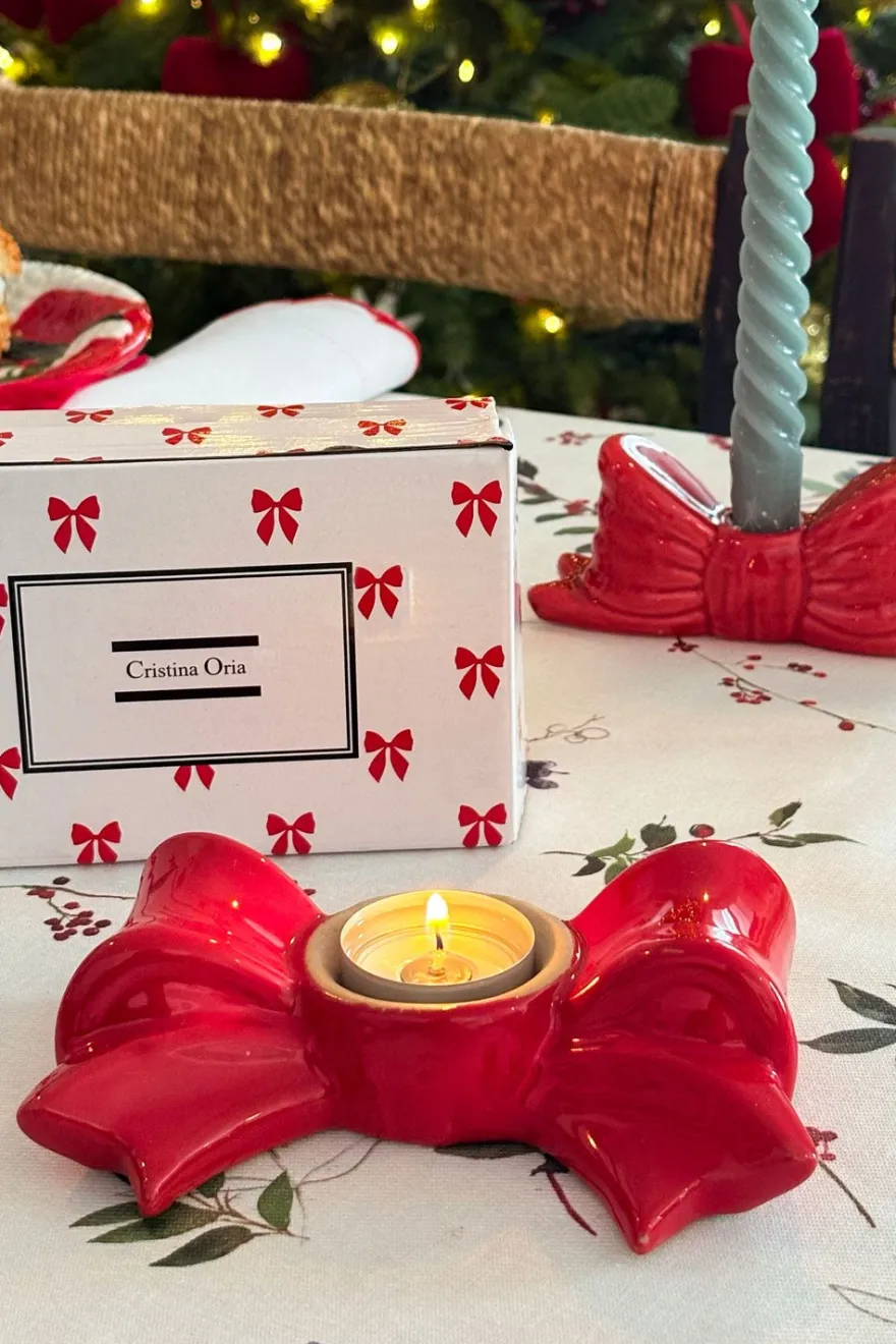 Este portavelas de porcelana con diseño de lazo rojo y acabado brillante, es ideal para complementar la decoración de tus mesas, estanterías o centros de mesa combinándolo con coronas y guirnaldas durante la temporada navideña.